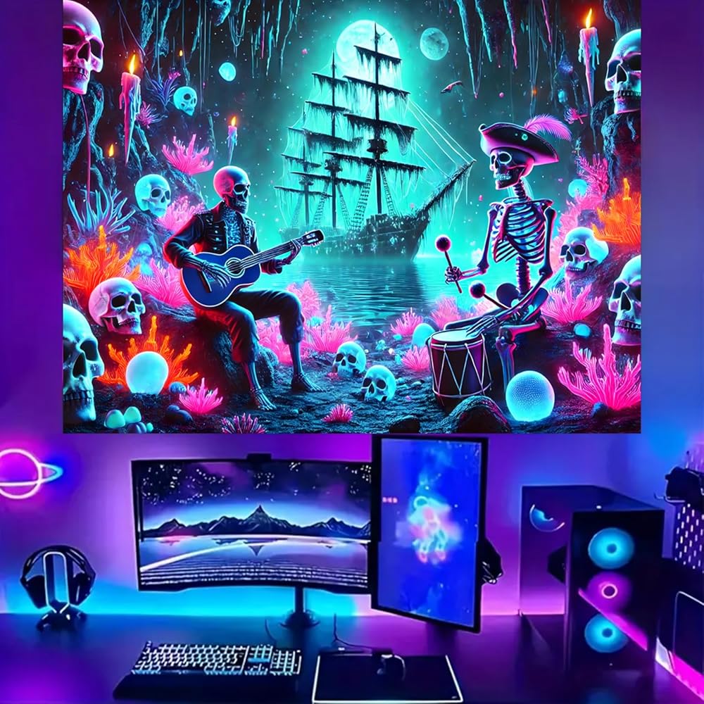 BSFHH Halloween Black Light Tapestry – UV Reactive Glow in the Dark Wall Hanging, Spooky Night Scene with Ghosts & Pumpkins, Haunting Home Decor for Parties, Bedroom, or Dorm (Guitar, 90L" x 70W", Unframed)