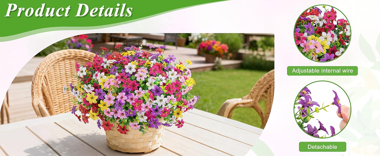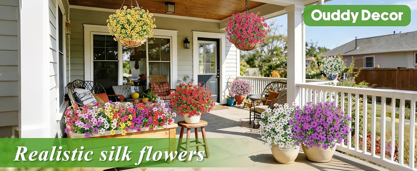 Multi-Functional Decoration: Lifelike artificial flowers for outdoors are the ideal choice for various decor for various indoor and outdoor scenes, such as hanging basket, porch, lawn, patio, yard, walkway, deck, veranda, balcony, window box, windows, garden, etc