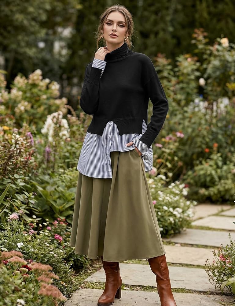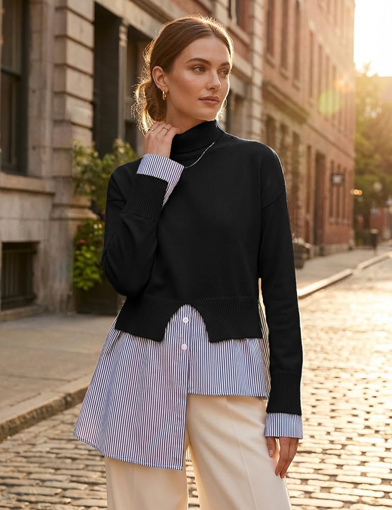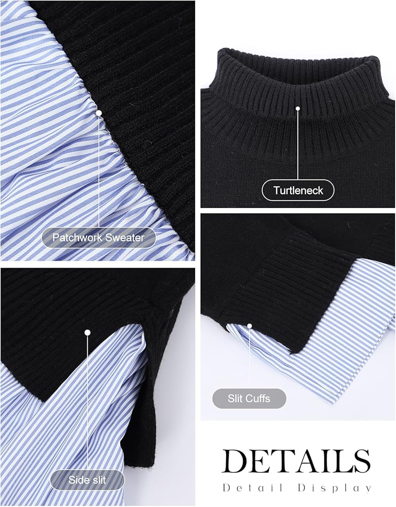 • 2-in-1 Design:This mock neck sweater features a stylish combination of a solid knit top and a striped shirt hem, creating a trendy layered look without the hassle of wearing multiple pieces.