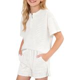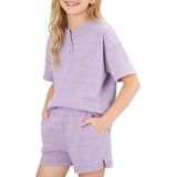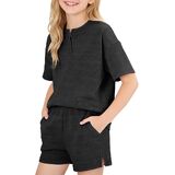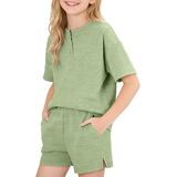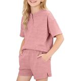 Original Design:Casual yet stylish 2 piece girls clothes set featuring a solid round neck top with three-button front and subtle drop shoulders, paired with matching shorts with side pockets and small side slits.
