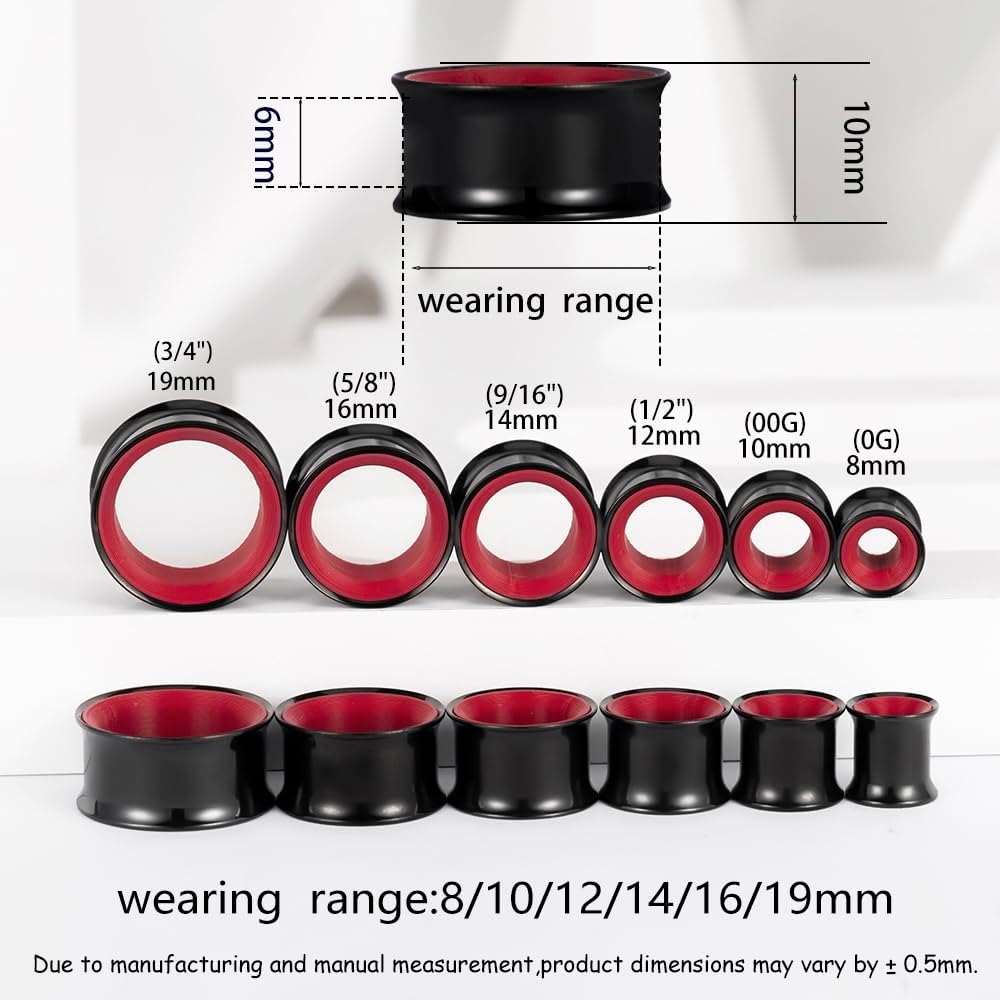 Value Package:You will receive 6 pairs of colorful ear gauges, available in 0g(8mm), 00g(10mm), 1/2"(12mm), 9/16"(14mm), 5/8"(16mm). Be sure to measure your current jewelry or refer to the sizing chart before purchasing for the best fit