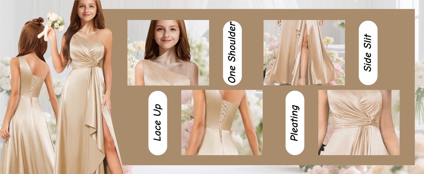 Desgin: This junior bridesmaid dresses for teen girls is made of satin, one shoulder girls formal dresses , satin long flower girl dresses for wedding with slit , junior bridesmaid dresses a-line,long pleated bridesmaid dresses for girls , ruffle prom dresses for teens with side silt , sleeveless junior dresses for teen girls formal,your little princess will be excited about this gorgeous satin dress.