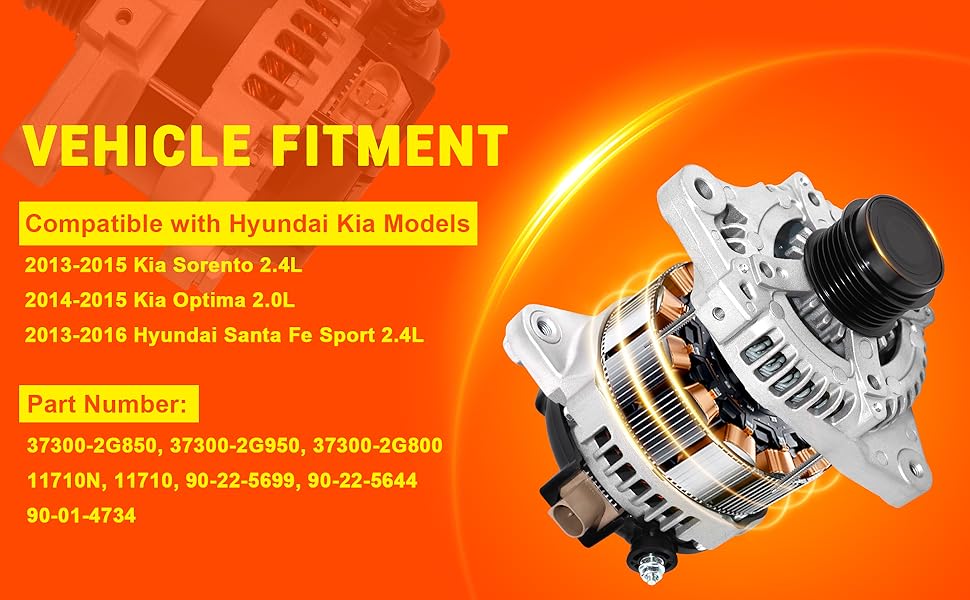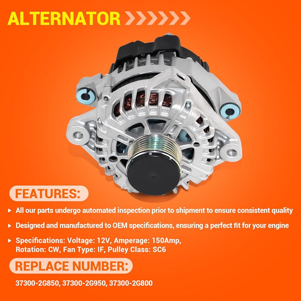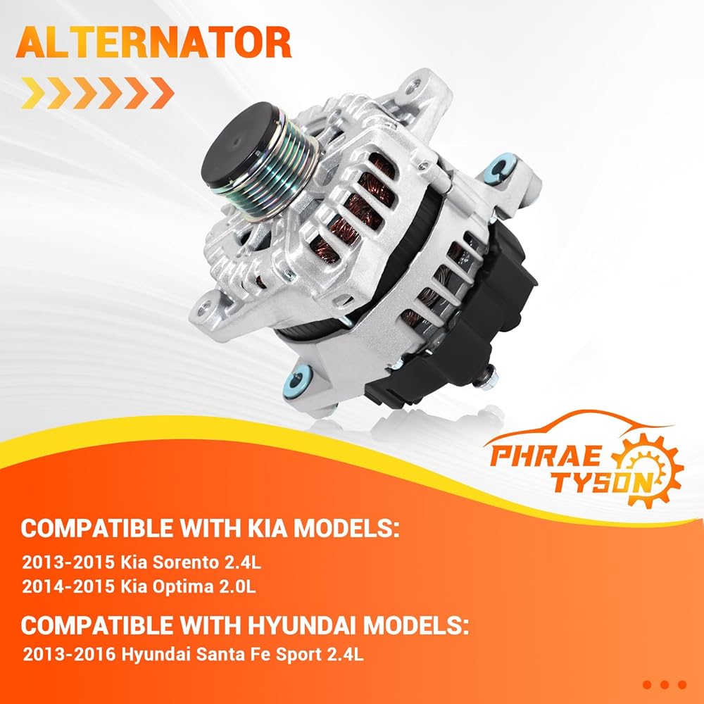 12V 150Amp High Output Alternator Compatible with 2013-2016 Hyundai Santa Fe Sport, 2013-2015 Kia Sorento 2.4L, 2014-2015 Optima 2.0L Replaces # 11710N 37300-2G850 90-22-5699