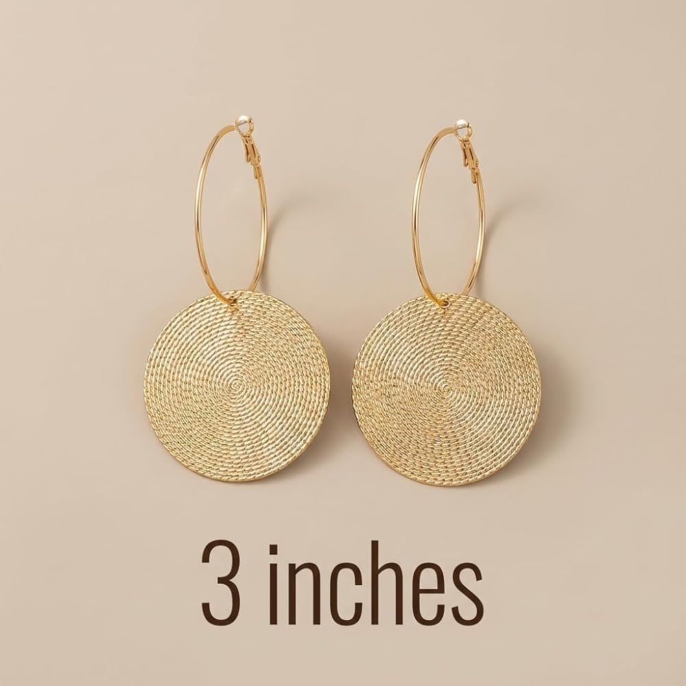 Hammered Gold Earrings for Women, Large Round Hoop Dangle Set with Vintage Textured Disc, Chunky Big Circle Statement Jewelry, Oversized Thick Metallic Coin Style Fashion Ornament