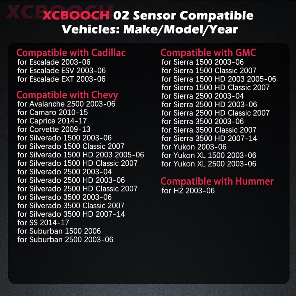 Direct Replacement: o2 sensor compatible with Cadillac for Escalade 2003-06, for Escalade ESV 2003-06, for Escalade EXT 2003-06; compatible with Chevy for Avalanche 2500 2003-06, for Camaro 2010-15, for Caprice 2014-17, for Corvette 2009-13, for Silverado 1500 2003-06, for Silverado 1500 Classic 2007, for Silverado 1500 HD 2003 2005-06, for Silverado 1500 HD Classic 2007, for Silverado 2500 2003-04, for Silverado 2500 HD 2003-06, for Silverado 2500 HD Classic 2007, for Silverado 3500 2003-06, for Silverado 3500 Classic 2007, for Silverado 3500 HD 2007-14, for SS 2014-17, for Suburban 1500 2006, for Suburban 2500 2003-06