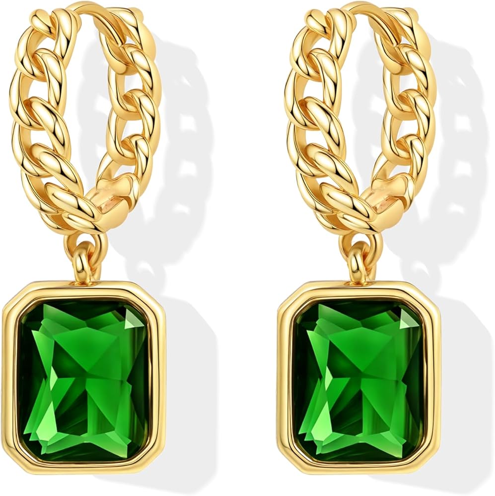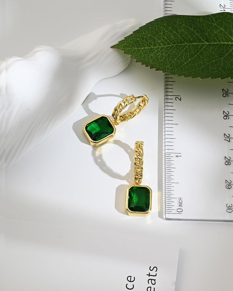[Emerald Green Design] These green earrings feature a textured gold chain hoop paired with a vivid square green emerald pendant, blending retro charm and modern statement style. The eye-catching combination makes these emerald green earrings a standout accessory, adding a bold, elegant touch to any look