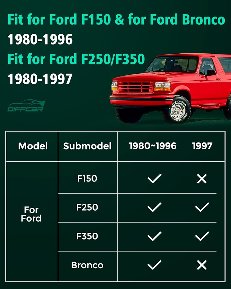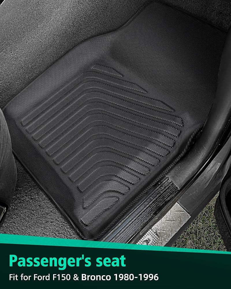 These truck floor mats are custom designed for Ford pickups and SUVs, for F-150 1980–1996, F-250 / F-350 1980–1997, and for Bronco 1980–1996. Ideal for owners searching for 1996 f150 floor mats, 1994 f150 floor mats, 1991 f150 floor mats, or 1986 f150 floor mats, this set provides reliable interior protection for older trucks where original flooring is hard to replace.