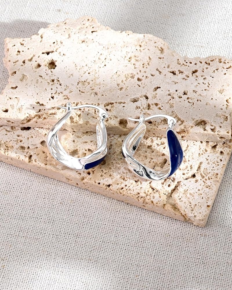 Elegant Twist Design: These blue hoop earrings feature a sophisticated silk-like twisted silhouette, accented with glossy royal blue enamel that contrasts beautifully with polished sterling silver. The unique enameled twist adds a modern, artistic flair to the classic huggie hoop shape, making them a standout statement piece for any jewelry collection