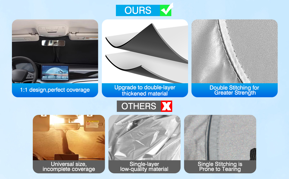 Upgraded Material: Windshield sun shade for hyundai palisade using double-layers 240T premium polyester, the high-density fabric can reflect and block 60% more sunlight and heat than 190T, providing better sun protection. Reinforced metal steel frame is strong and durable, flexible and not easy to break, can be reused for many years