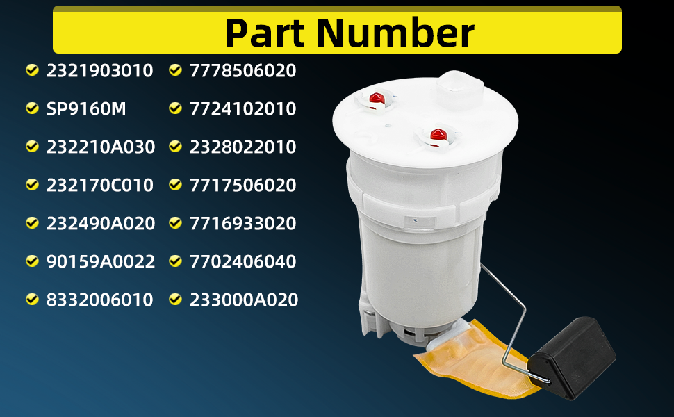 رقم الجزء: مضخة الوقود تحل محل 2321903010، SP9160M، 90159A0022، 232170C010، 232210A030، 232490A020، 8332006010، 7778506020، 7724102010، 2328022010، 7717506020، 7716933020، 7702406040، 233000A020