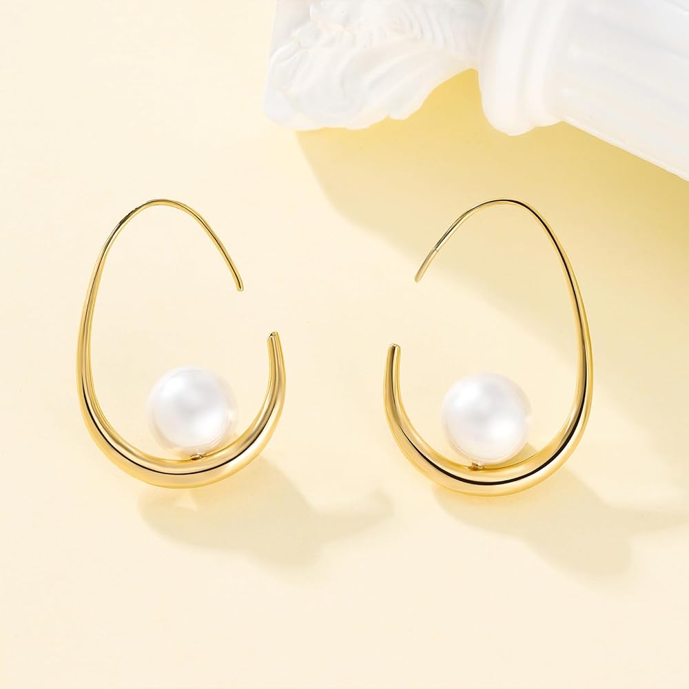Pearl Hoop Earrings:The Pearl and Gold Earrings are Designed as an Open Teardrop Hoop, with the Bottom Bent to Become Thicker and Wider, and the Top Thin