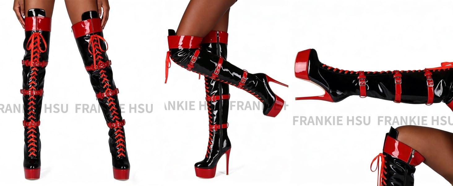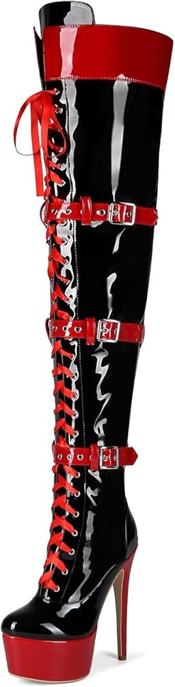 Design: This black red patent over knee high boots are designed with classic color, high quality microfiber, belt zip style, tall thigh, thin stiletto high-heel, rubber sole.