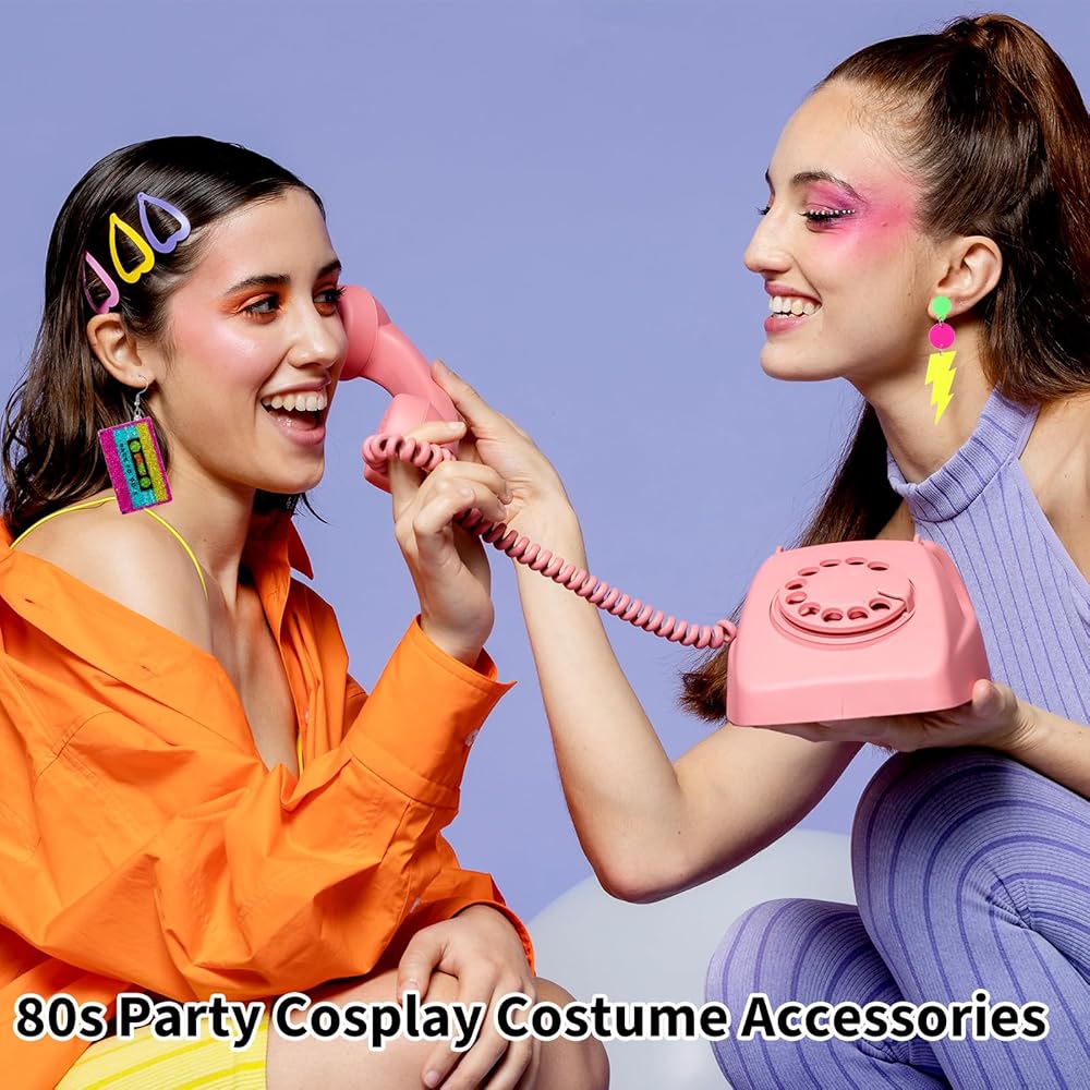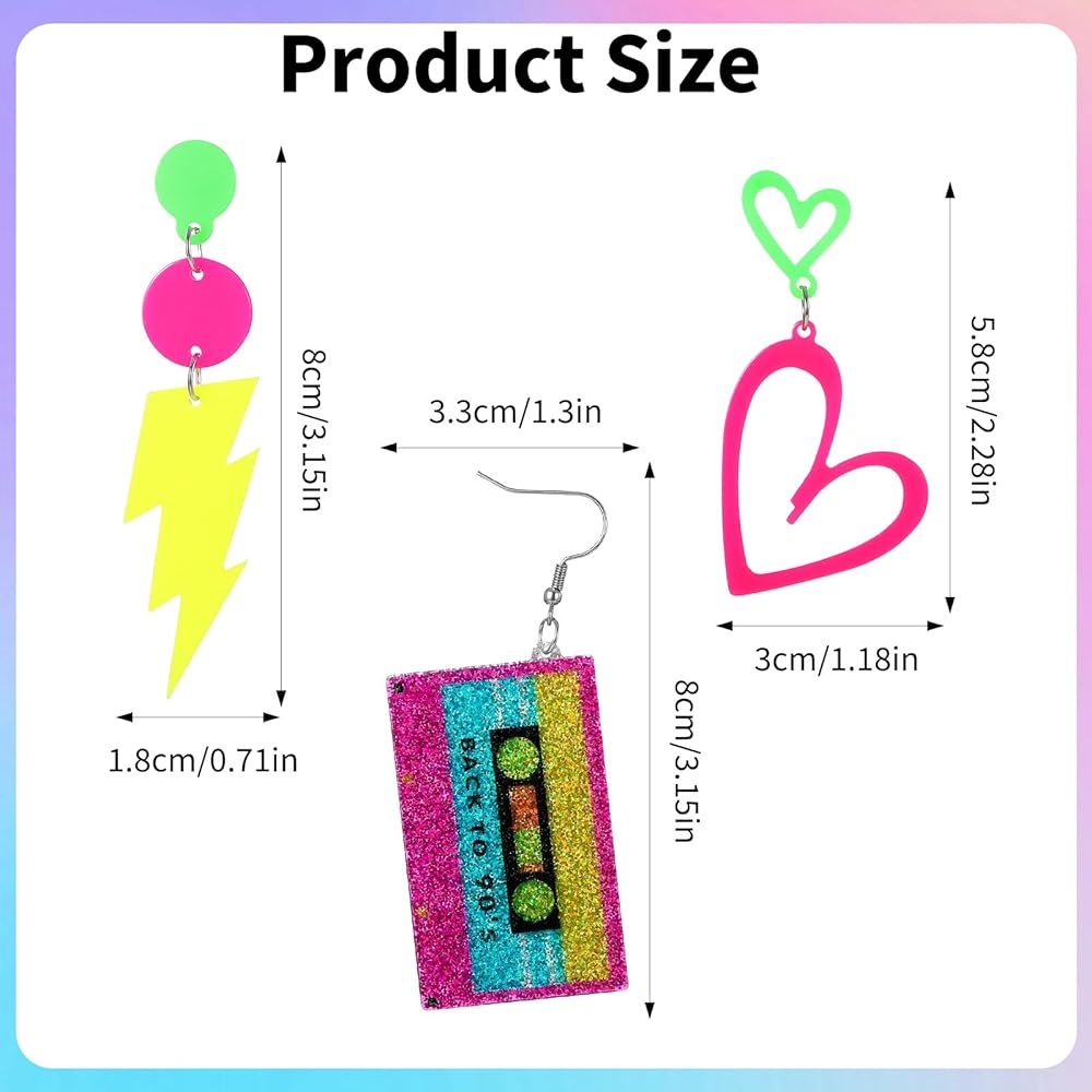 • Special Design: Three pairs of vibrant 90s retro acrylic earrings in heart, lightning bolt, and cassette tape shapes, offering a special and novel look, making you stand out at 80s and 90s-themed parties and attracting attention. 90s outfits for women are especially suitable for Halloween parties, 70s/80s-themed events, neon parties, or everyday wear. 80 accessories for women