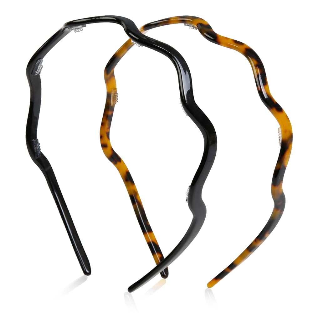 WOVOWOVO 2 Pcs Wavy Headbands for Women, Comfortable Skinny Head Bands for Womens Hair, Acetate Hairbands with Teeth Non Slip, Classic Black Tortoiseshell Hair Accessories
