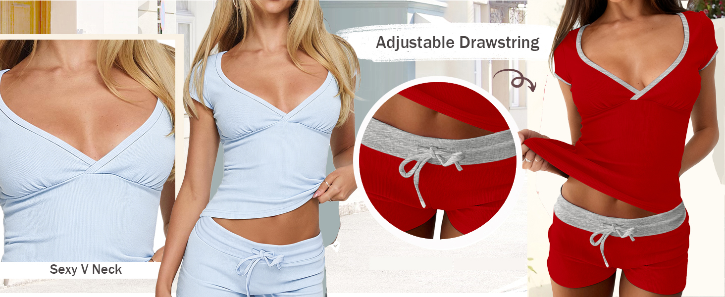 Feature: Sexy pajamas for women, v neck, short sleeve, shorts set, y2k style, sexy, super soft and comfy, breathable and lightweight fashion sexy pj set for women. It is a essential pajama set in your wardrobe