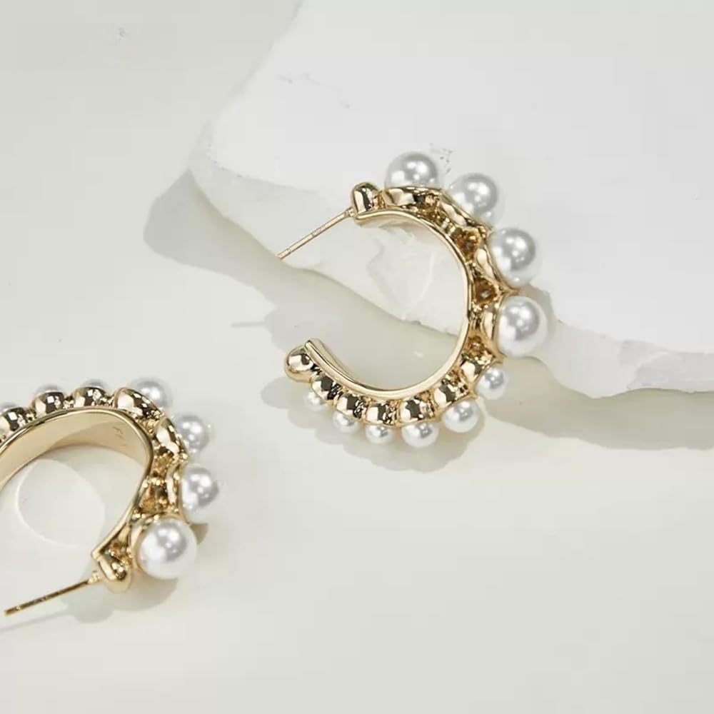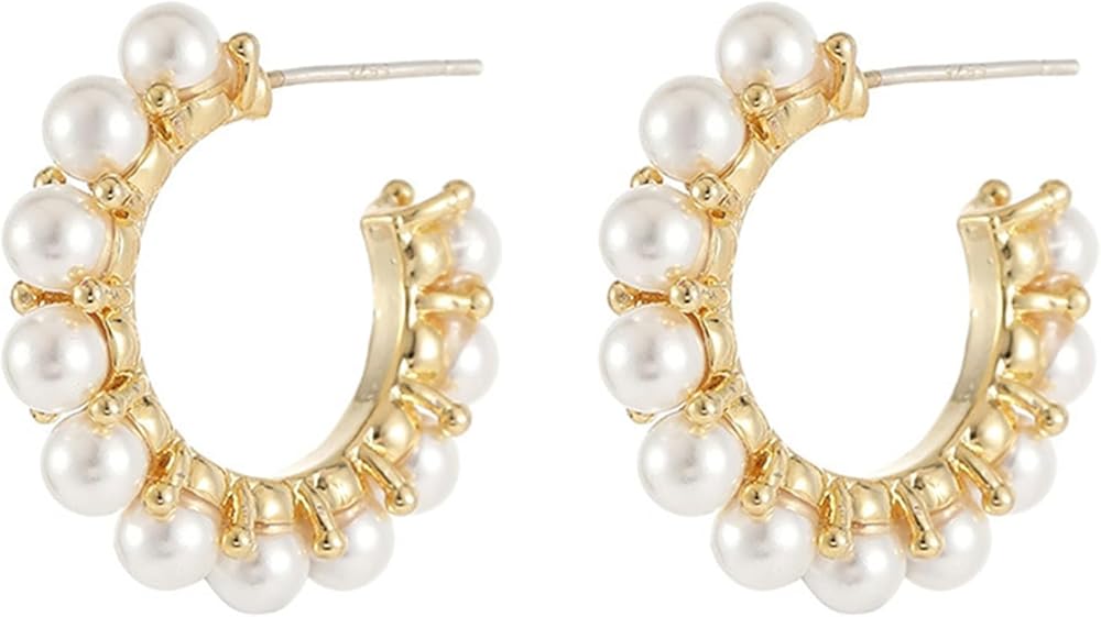 Elegant C-Shaped Design: The open pearl hoop earring features a polished gold frame embedded with a continuous row of lustrous mini pearls, creating a chic contrast between warm metallic shine and soft pearlescent glow, lightweight design and stay securely in place through daily