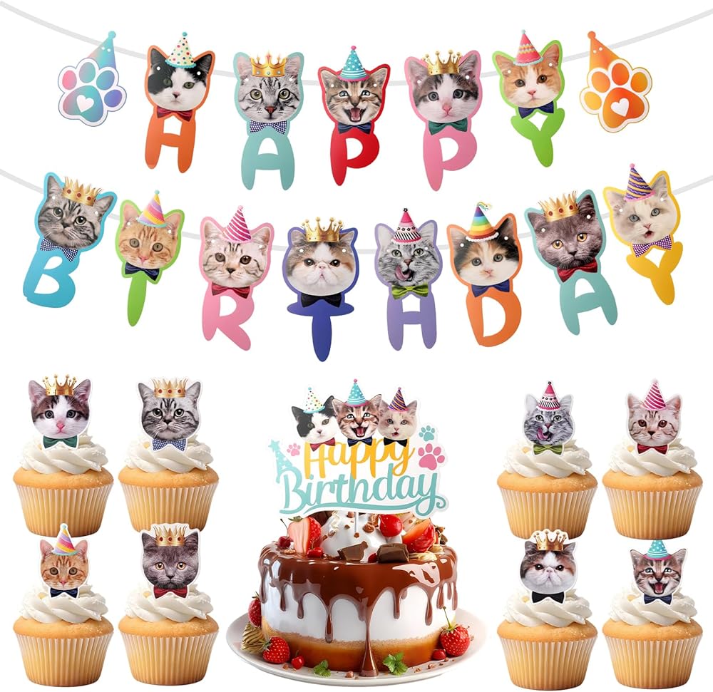 Unique Cat-Themed Design to Spark Creative Party Styling: Featuring adorable cat face cutouts, playful "happy birthday" lettering, and a mix of garlands and cake toppers, this set of cat happy birthday banner blends cuteness with versatility, you can hang the cat happy birthday banner above the cake table or party backdrop, use small toppers on cupcakes, and place the large topper on the main cake; the photographic cat faces birthday banner and cat facebday party bunting decorations design inspires creative arrangements, from minimalist cat-lover parties to elaborate kids' birthday setups