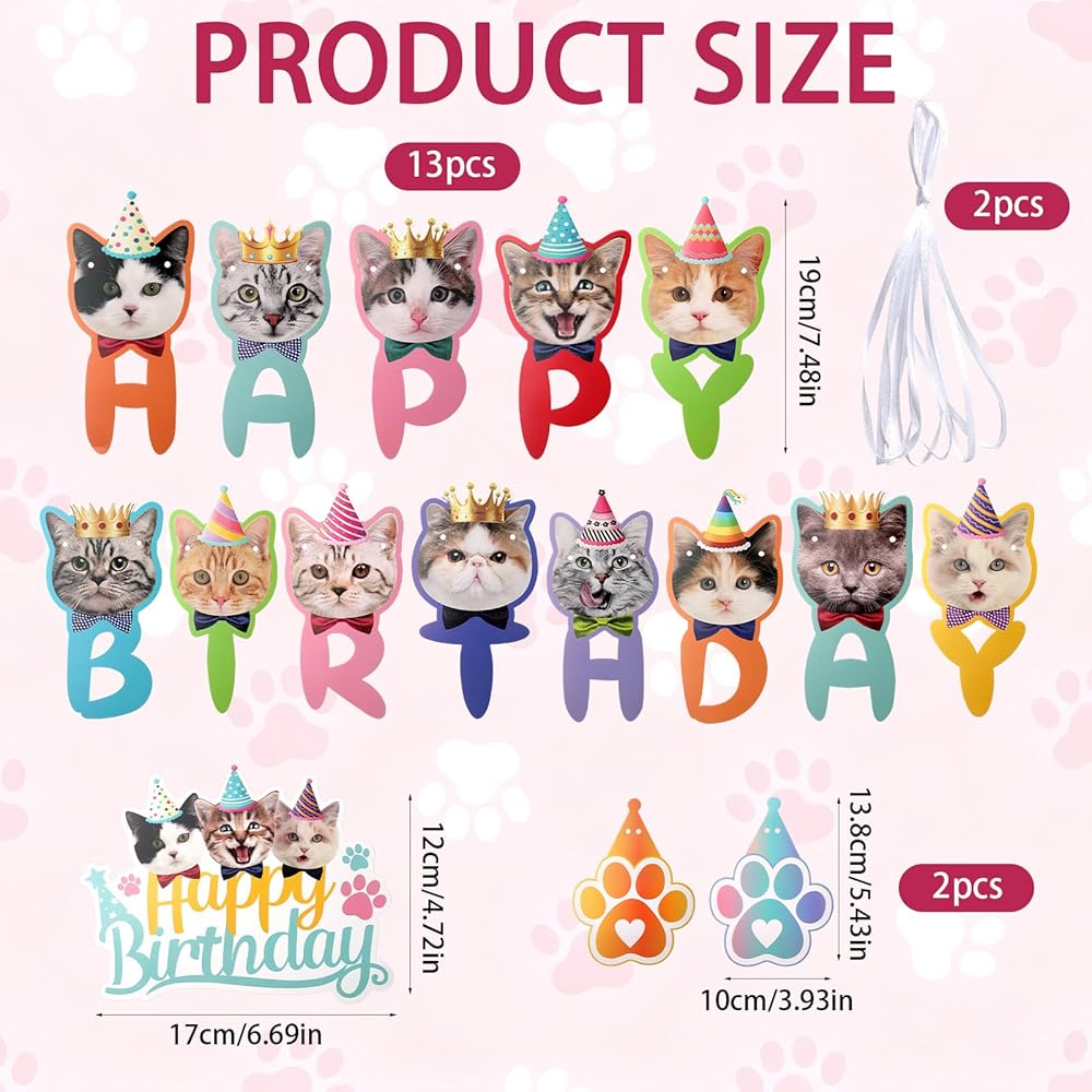 Product Quantity & Size: This package of cat happy birthday banner includes 1 full set of cat birthday decorations, 2 birthday garlands, 8 small cake toppers, and 1 large cake topper, all with a main size of 4.4x7 inch, providing a cohesive decor solution for feline-themed celebrations, making the birthday cat garland and cat happy birthday banner perfect for instantly elevating party vibes, and the all-in-one set of birthday banner ensures you don't need to buy additional decor pieces separately