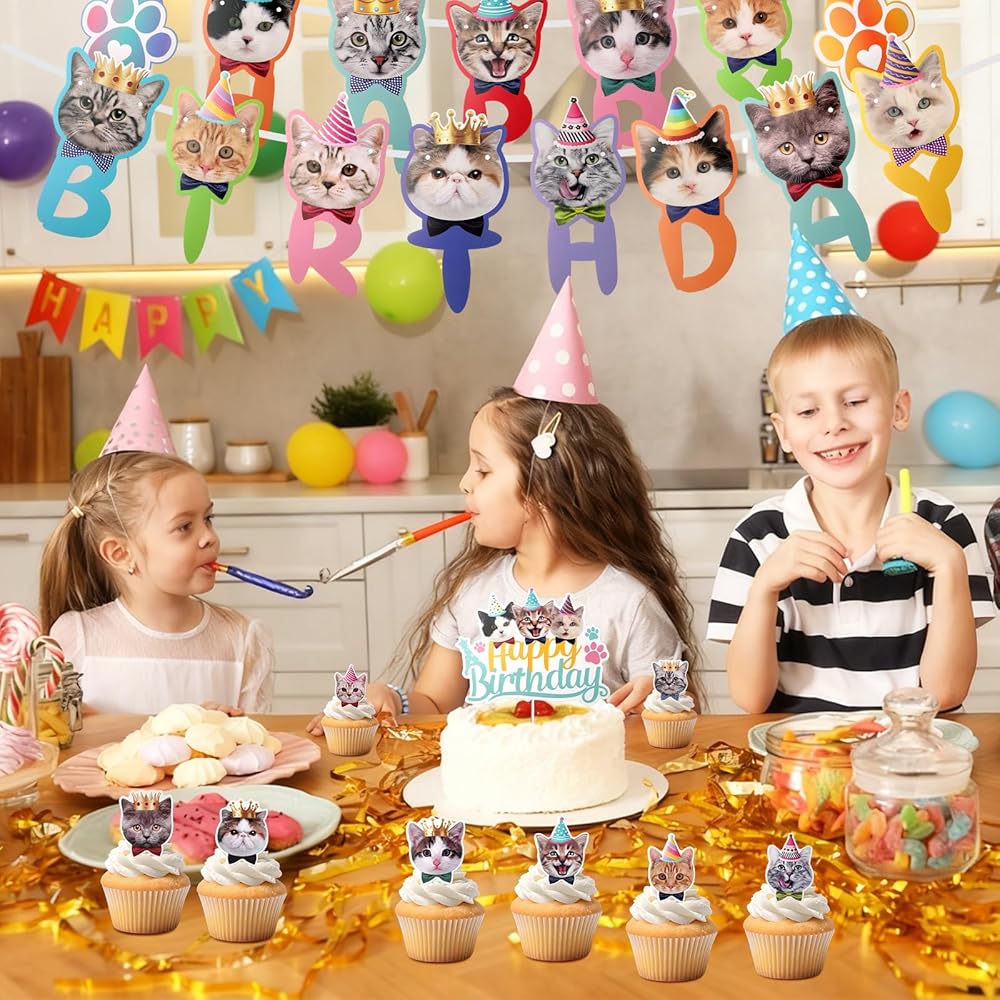 Wide Application: cat themed birthday party decorations work as cat theme birthday party decorations for cat owners' birthdays, feline-themed parties, or even pet cat "birthday" celebrations, serves as photographic cat faces birthday banner for party photo booth backdrops or social media photo props, and functions as kitties day party bunting decoration for indoor spaces like living rooms, dining rooms, or party halls; it's also ideal for gifting to cat lovers or party hosts, making it a multi-functional essential for any cat-themed birthday event