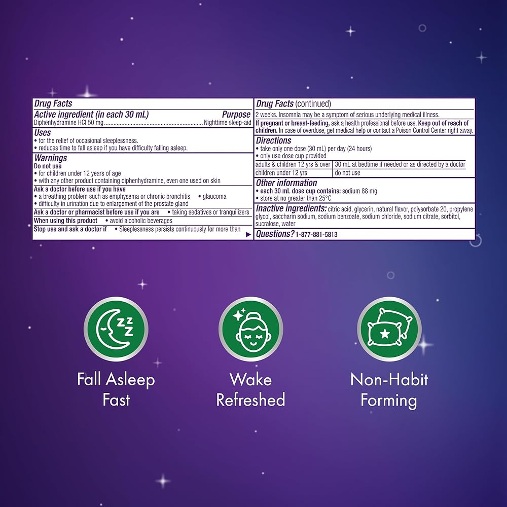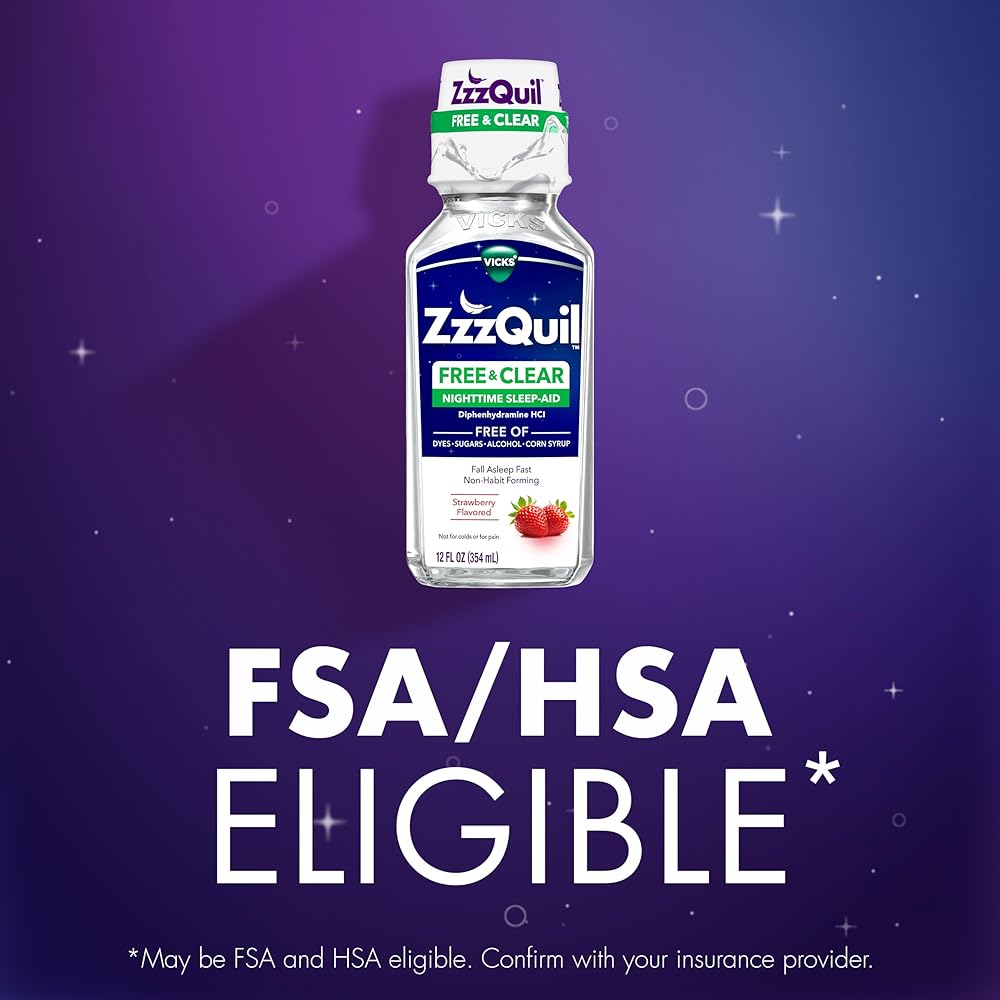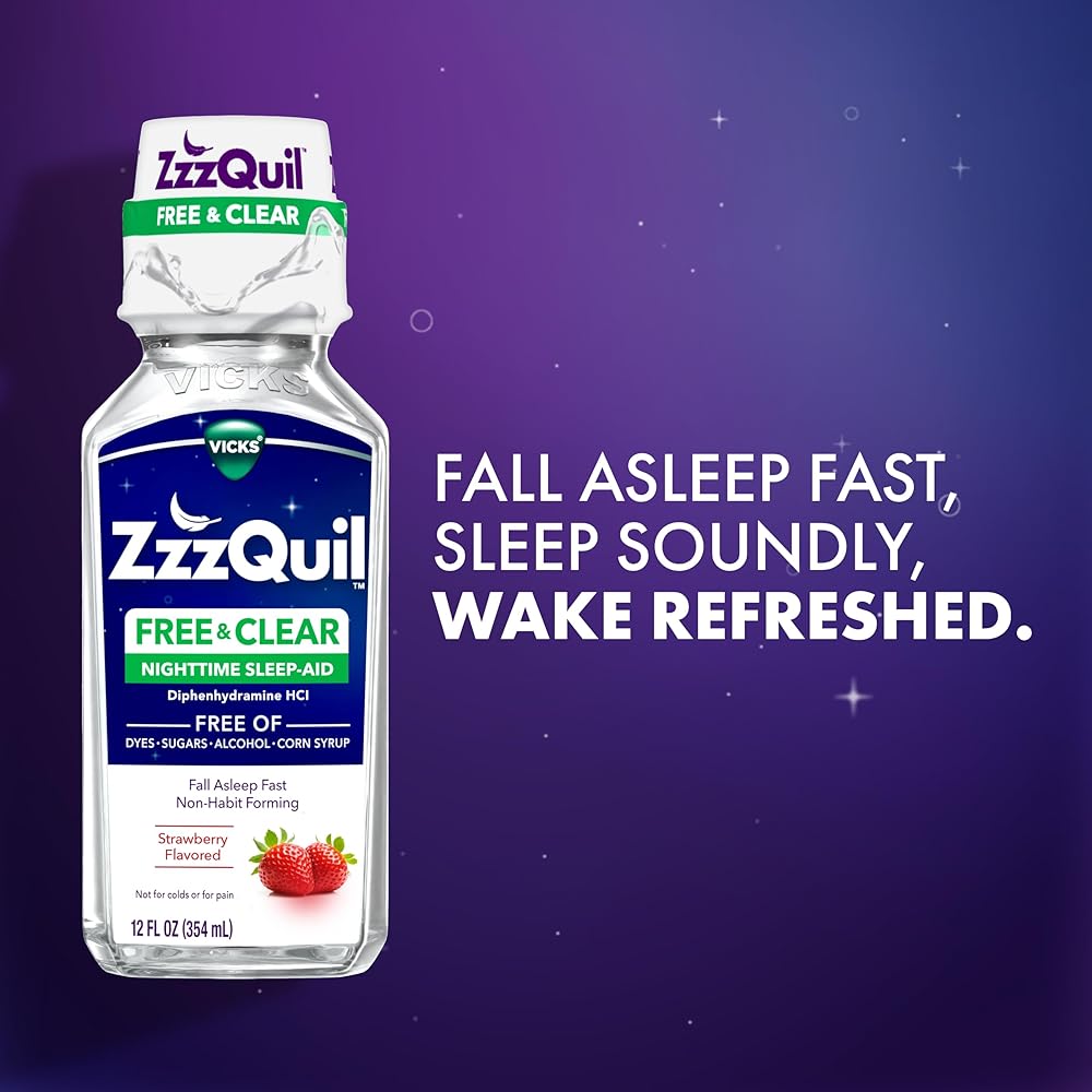 When you're having trouble getting that sound sleep your body craves, add some Zzzs to your night with ZzzQuil. This ZzzQuil sleep aid works to help you fall asleep fast – in as little as 20 minutes**– so you can get sleep when you need it and wake refreshed. All ZzzQuil sleep aid products are non-habit forming and specifically formulated with clinically proven ingredients by our team of dedicated scientists. This ZzzQuil sleep aid is non-habit forming and contains Diphenhydramine HCI, which causes drowsiness by blocking the action of histamine, a chemical that sends waking signals to the brain. For this sleep aid, each dose (one 30 mL dose cup) contains 50 mg. This non-habit-forming sleep aid has what you need for a great night's rest without the stuff you don't – no high fructose corn syrup, alcohol, or artificial dyes. ZzzQuil FREE & CLEAR Liquid Sleep Aid is Strawberry Flavored and tastes great – you'll look forward to falling asleep whether you are at home or traveling through multiple time-zones. ZzzQuil over-the-counter medicine sleep aids for adults can be used to treat occasional sleeplessness when you need a little extra help getting to sleep. ZzzQuil is the World's #1 Sleep Aid Brand!† Explore ZzzQuil's range of products to help you fall asleep, including our line of ZzzQuil PURE Zzzs Melatonin products. †Source Euromonitor International Limited; Consumer Health 2024 Edition; Sleep Aids, all channels, retail selling price, Global Brand Name ZzzQuil 2023 data **in a randomized, double-blind, placebo-controlled, in-home, crossover study, in subjects suffering from occasional sleeplessness (n=22) ^ vs. placebo
