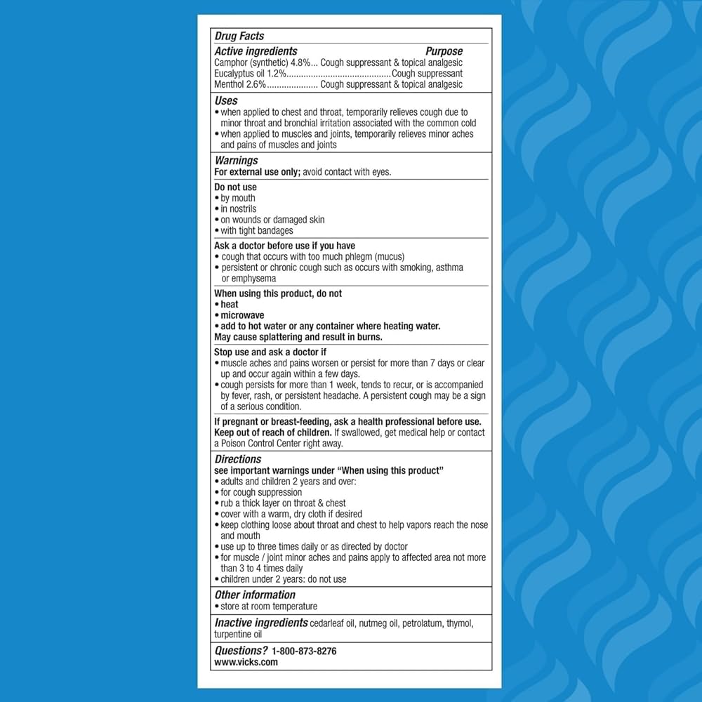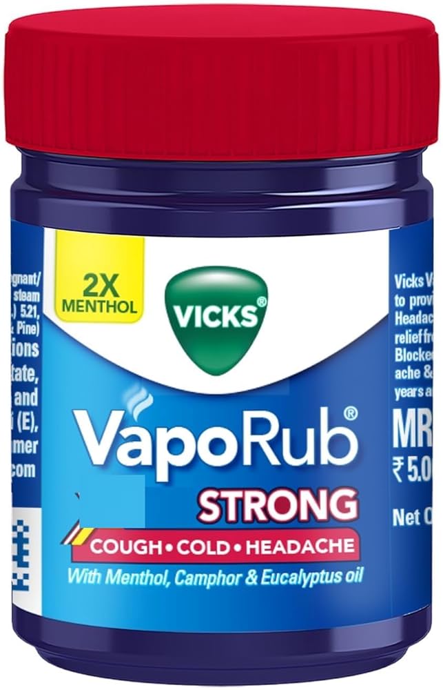 Relief from your family's toughest cough, cold, & headache Contains 2X proven active ingredients such as Camphor (synthetic) 4.8% (Cough suppressant and topical analgesic) Eucalyptus oil 1.2% (Cough suppressant) Menthol 2.6% (Cough suppressant and topical analgesic)