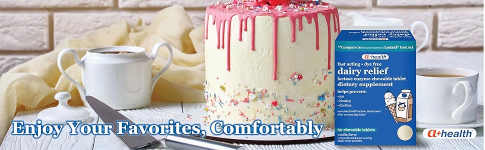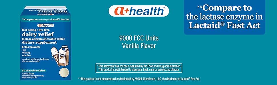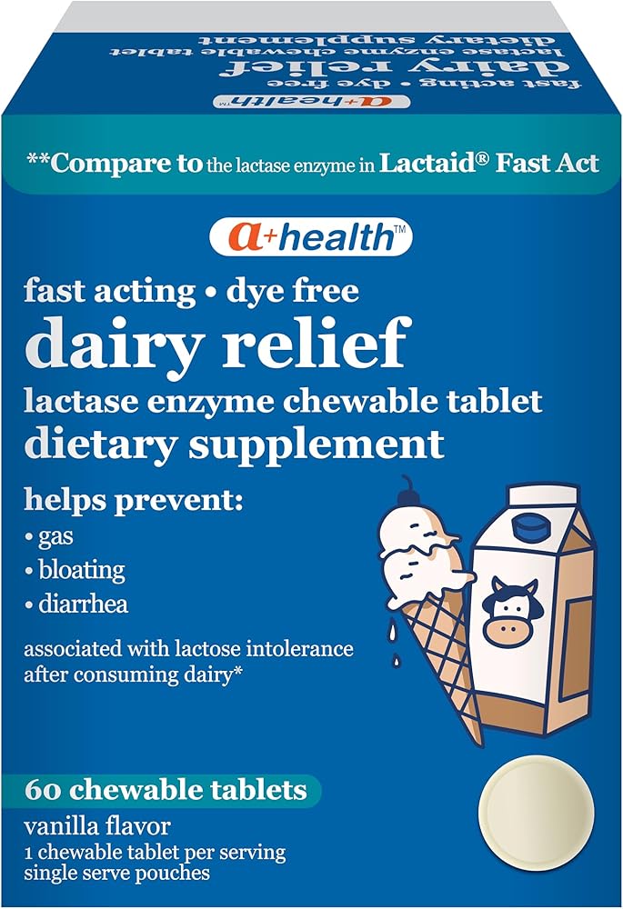A+Health Dairy Relief Lactase Enzyme 9000 FCC Chewable Tablets are fast-acting and dye free. Compare to the lactase enzyme in Lactaid Fast Act. The product helps to prevent symptoms such as gas, bloating and diarrhea associated with lactose intolerance after consuming dairy. It helps to prevent the symptoms by breaking down the milk sugar (lactose) and making dairy foods easier to digest. This product is a dietary supplement, NOT A DRUG. It contains a natural lactase enzyme and may be used by adults and children 4 years and over. This product may be used with every meal or snack containing dairy. Each box includes 60 single serve pouches with chewable tablets in a delicious vanilla flavor.