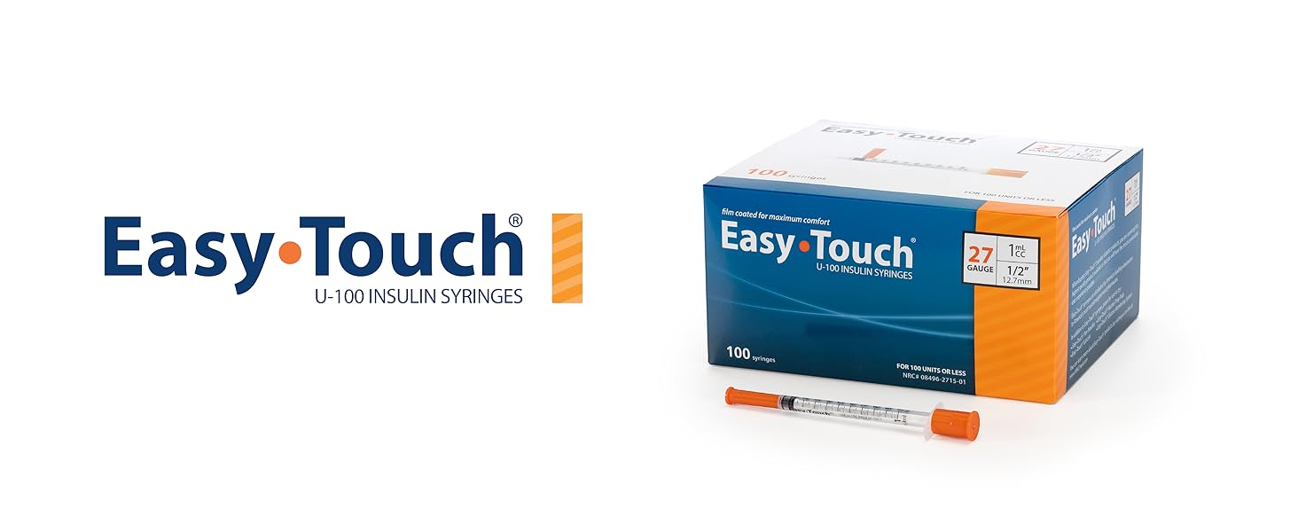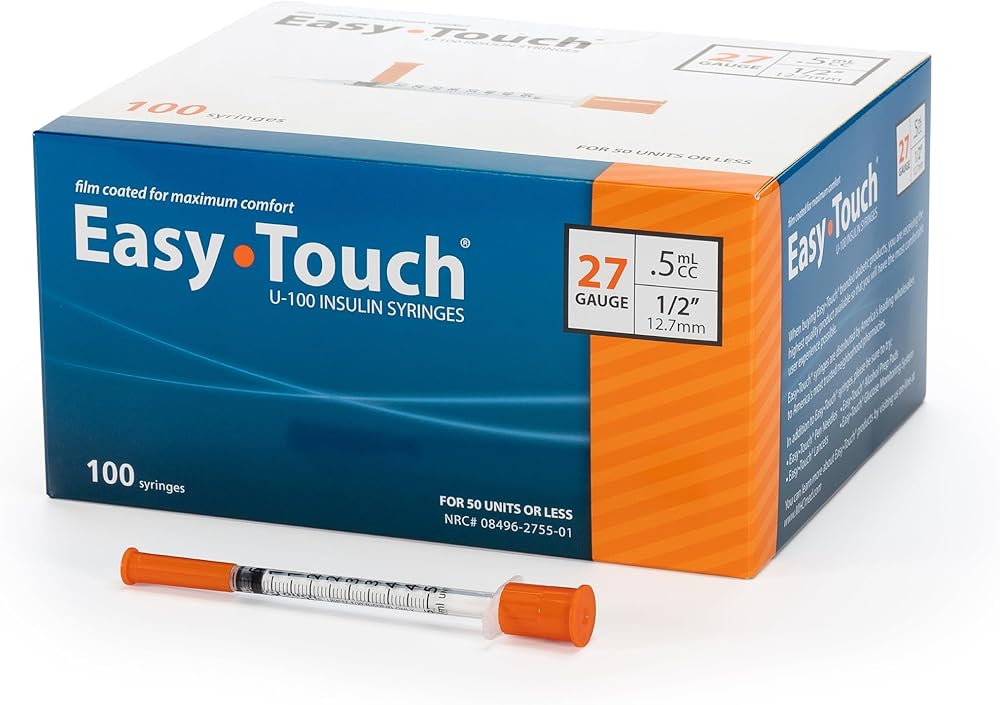 Easy Touch 27 Gauge U-100 Insulin Syringes (27G 0.5cc 1/2") with 1/2" Long Needle, 0.5cc (50 Unit Capacity), Bold Markings for Accurate Dosing, Disposable, Box of 100
