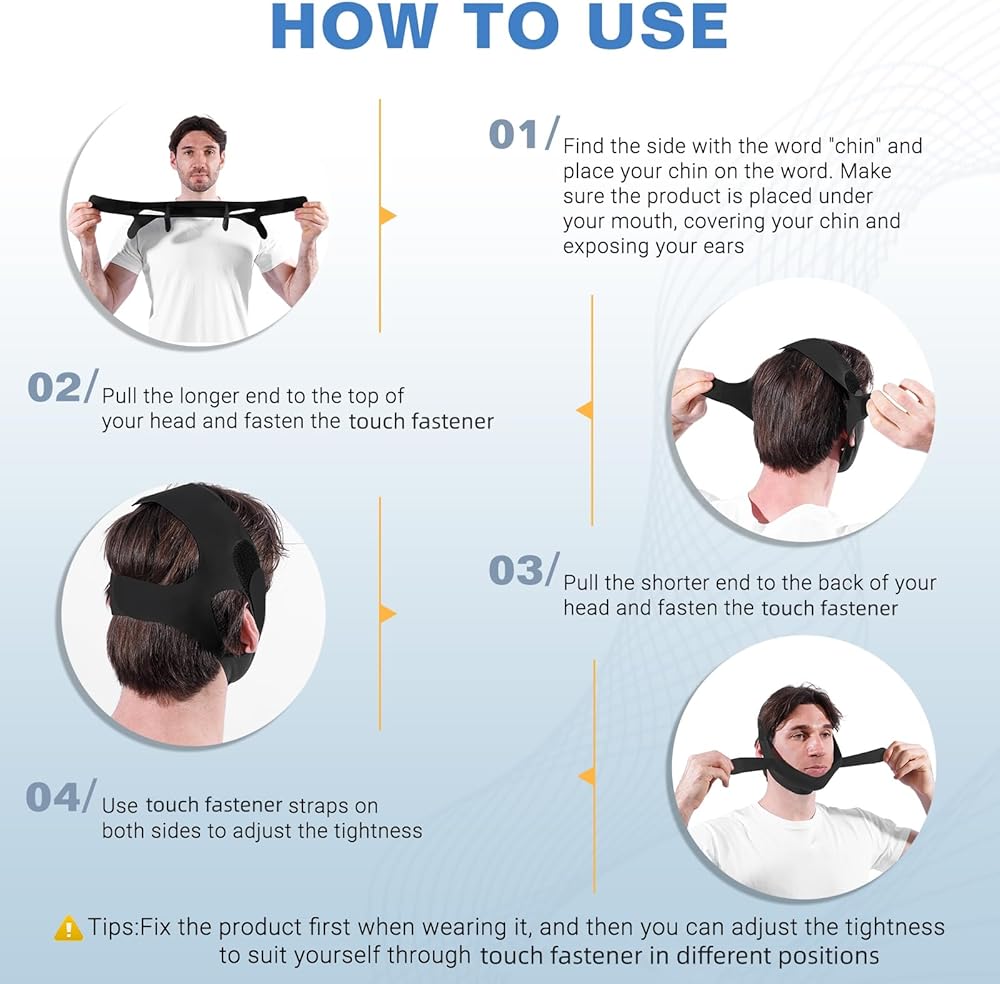 Easy to use: Find the "chin" clearly marked on the anti-snoring chin strap and place your chin firmly there. Take the longer end of the strap and pull it over your head to secure the top touch fastener. Next, pull the shorter end behind your head and secure the touch fastener at the back. Adjust the touch fastener on the left and right sides to your personal preference for tightness