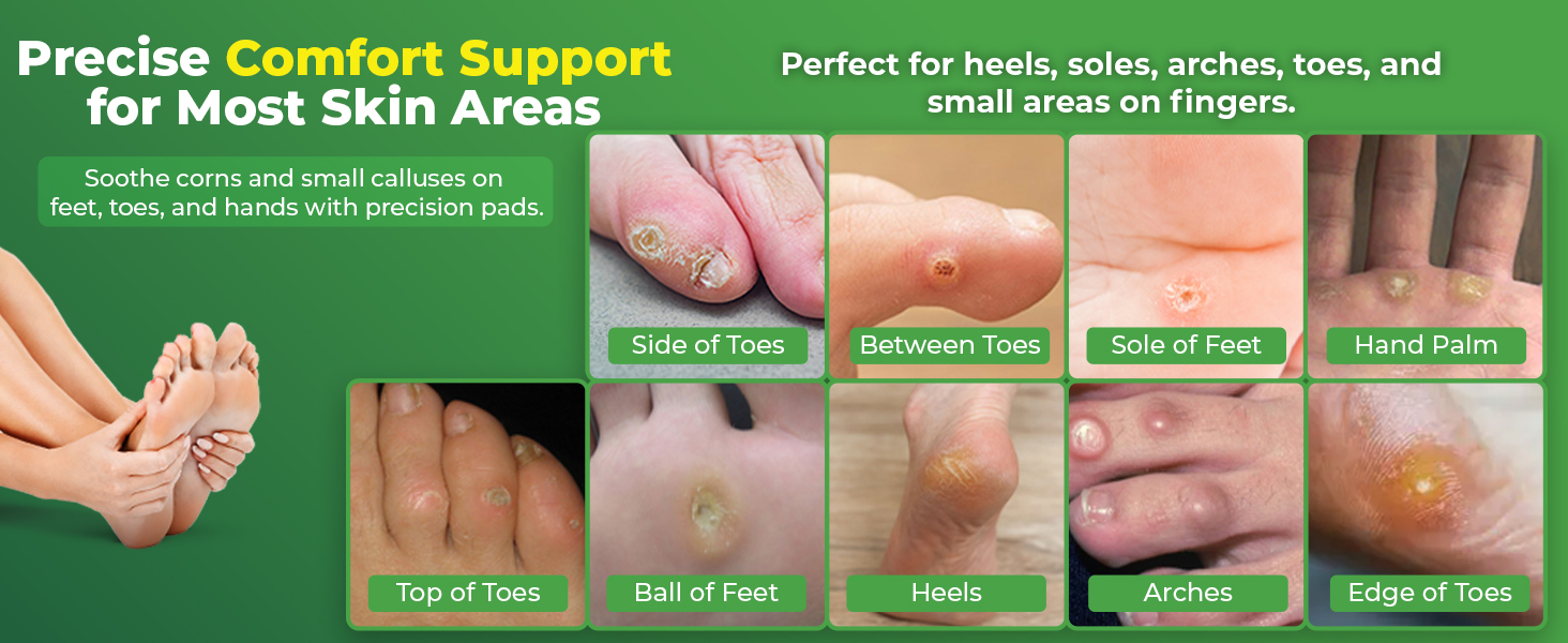 Comprehensive Coverage for Corns and Small Calluses: No matter where your corns or small calluses are located, our corn remover pads can help. Suitable for the top of toes, bottom of feet, between toes, side of feet, ball of foot, heel, outer edge of toes, arch of foot, and small calluses on fingers and hands. For larger calluses, consider additional treatments for best results. Get relief wherever you need it!