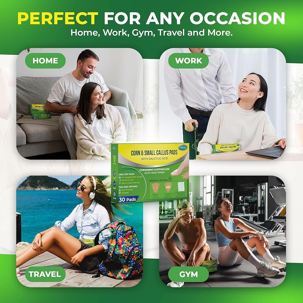 Effective Corns and Small Calluses Treatment for Everyone: Do you or someone you know suffer from persistent and stubborn corns or small calluses? Our corn remover pads are perfect for kids, adults, seniors, athletes, runners, and workers who spend long hours standing. Whether caused by high-heeled shoes or prolonged standing, our product provides fast and effective relief. Use them at home after a long day, before exercising, during work or school, before bed, or while traveling.