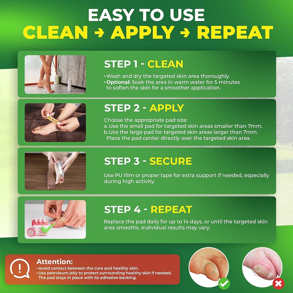 Easy Application Process: 1. Clean the corn or small callus area. If needed, soak in warm water for 5 minutes to aid removal. 2. Choose the red medicated core size that fits your corn or small callus-use the small pad for corns or small calluses smaller than 7mm and the large pad for those larger than 7mm. 3. Avoid contact between the medicated core and healthy skin. For better adhesion, use the extra PU film provided or other medical tape. 4. Change the pad daily or as needed.