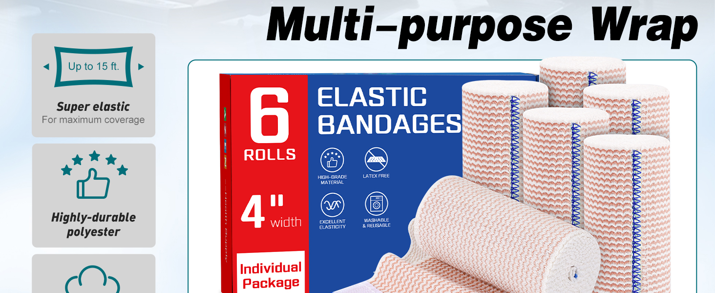 Individually packed: 6 packs of individually packed 4 inch compression elastic bandage is a perfect complement to the first aid kit and home wound care products. Our bandages are a standard length of 5 feet, and the maximum stretch length of the product is 15 feet for maximum coverage. And is easy to store and carry