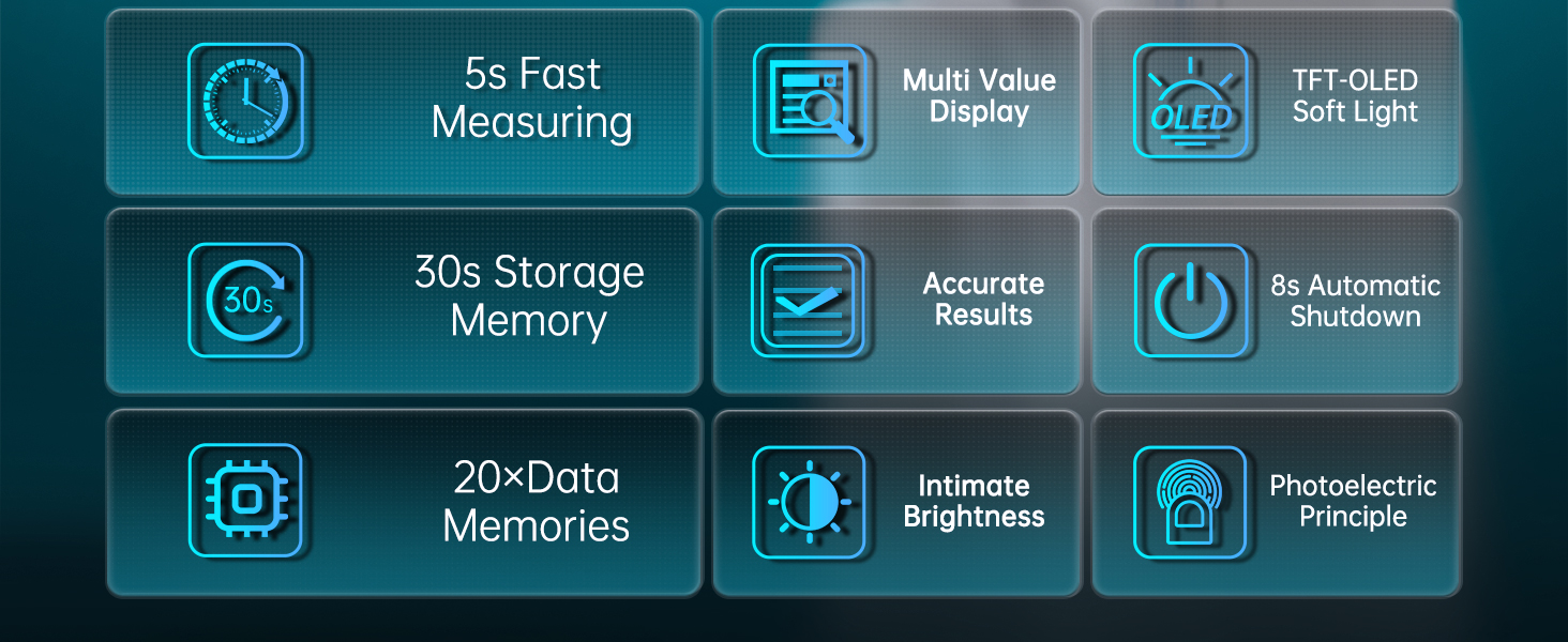 20 × MEMORY FUNCTION - Pulse oximeter with memory measurement 30s countdown automatic memory results. Finger oxygen monitor displays the latest 5 measurement results on startup, and you can access the settings to view a memory of 20 measurement results. O2 sensor's good for you to keep track of your oxygen levels for 20 days during rest or exercise