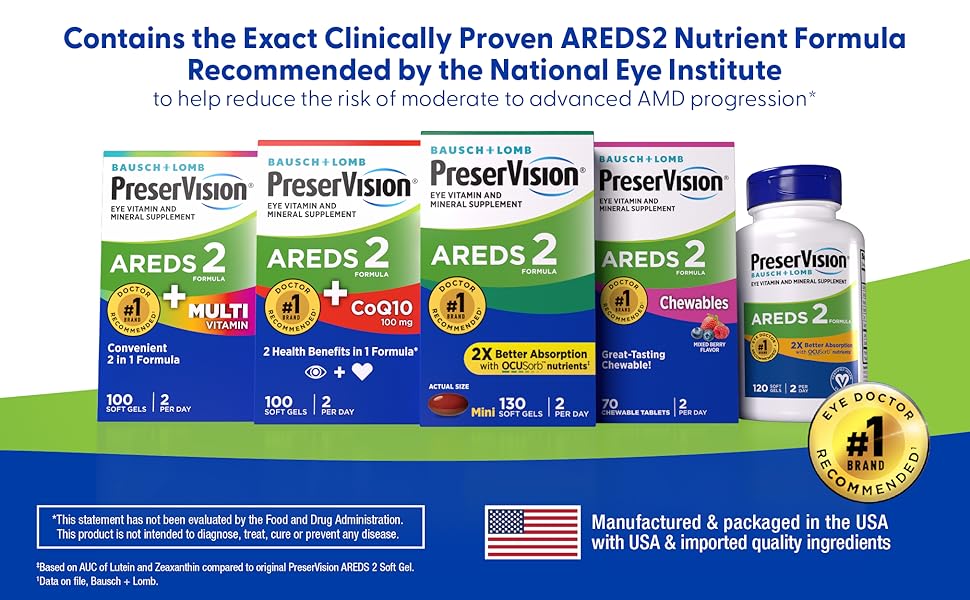 PreserVision AREDS 2 Formula Eye Vitamin and Mineral Supplement, from the eye care experts at Bausch + Lomb, contains the exact levels of six nutrients recommended by the National Eye Institute to help reduce the risk of progression in people with moderate to advanced Age-related Macular Degeneration (AMD)*. The 6 nutrients found in these eye health vitamins include lutein, zeaxanthin, vitamin E, vitamin C, zinc, and copper. PreserVision is the most studied eye vitamin brand (based on the AREDS and AREDS2 clinical studies). PreserVision AREDS 2 Formula Eye Vitamin and Mineral Supplement soft gels are eye supplements that build on the original, clinically proven PreserVision AREDS formula, with lutein and zeaxanthin replacing beta-carotene based on the National Eye Institute's Age-Related Eye Disease Study 2 (AREDS2). Ask your doctor if PreserVision AREDS2 Formula is right for you. Soft Gels with 6 Essential Nutrients. Recommended by the National Eye Institute. AREDS 2 Formula with Lutein and Zeaxanthin Replacing Beta-Carotene. #1 Doctor Recommended Brand1. 2 Soft Gels Per Day1Data on File for #1 Doctor Recommended Brand, Bausch + Lomb. PreserVision AREDS 2 Eye Vitamin & Mineral with OCUSorb, Contains Lutein & Zeaxanthin, 90 Softgels