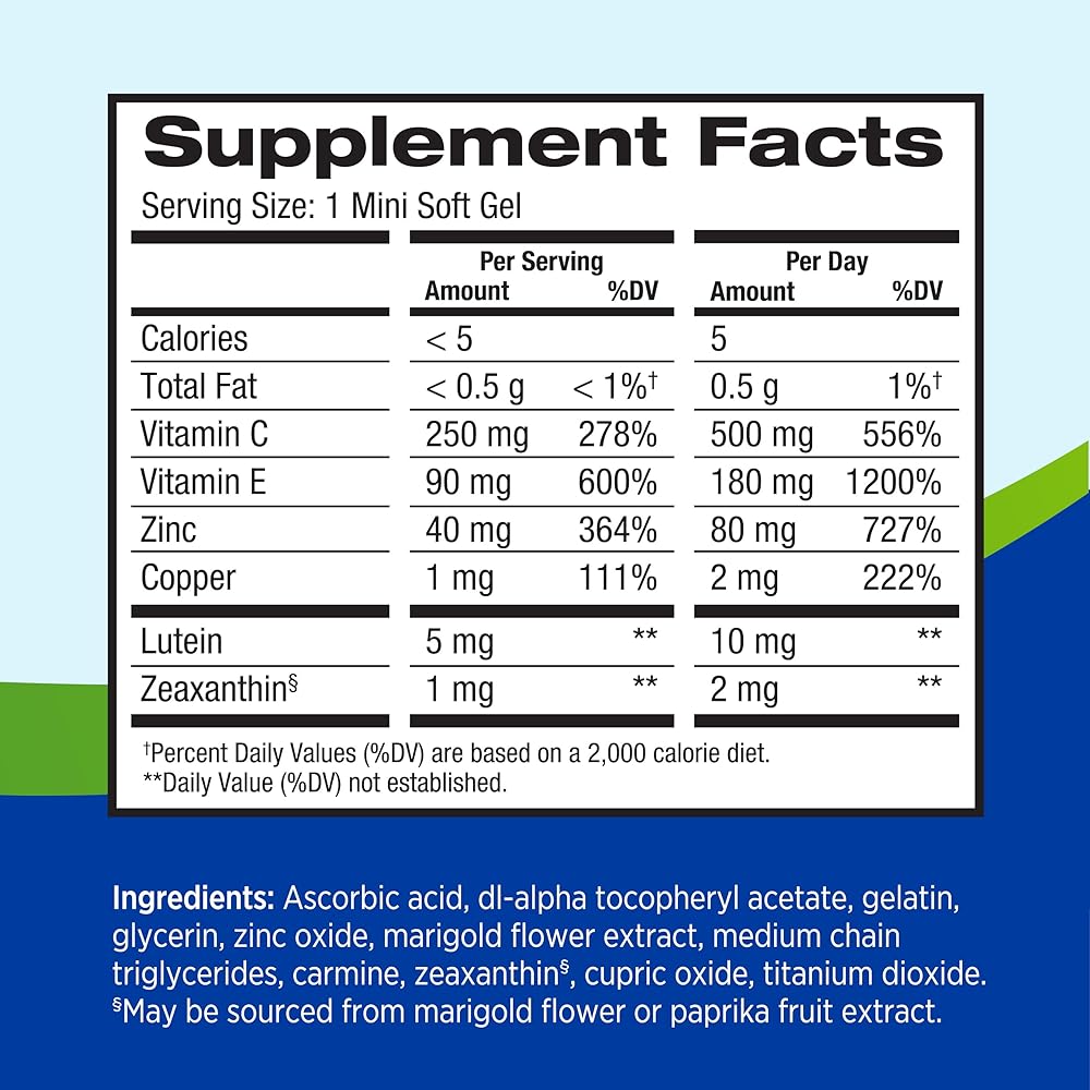 RECOMMENDED FORMULA: This formula includes lutein, zeaxanthin, zinc, copper, vitamin C, and vitamin E to exactly match the nutrient formula recommended by the AMD experts at the National Eye Institute based on the Age Related Eye Disease Study 2 to help reduce the risk of moderate to advanced AMD progression.