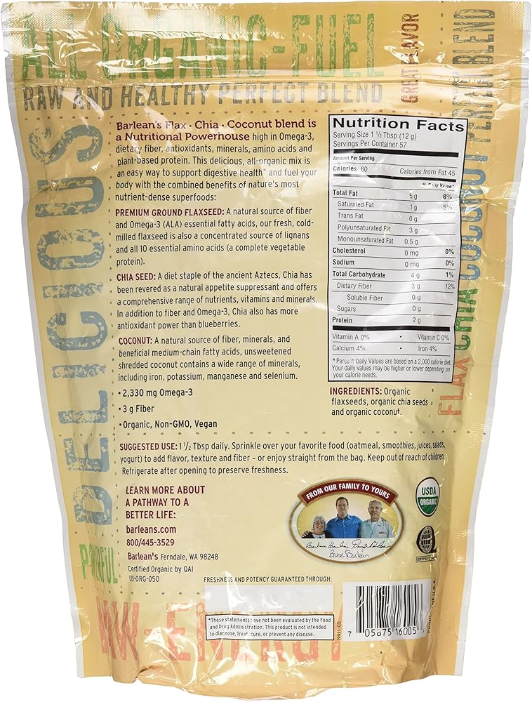 A nutritional powerhouse! It's high in Omega-3 (ALA) and is packed with dietary fiber, antioxidants, minerals, amino acids and plant-based protein. This delicious, all-organic mix is an easy way to support digestive health* and fuel your body with the combined benefits of nature's most nutrient-dense superfoods. Plus, they're pretty versatile and fun to add to just about anything. So, go ahead and blend in a smoothie, mix into yogurt, sprinkle over salads or add to baked goods. Sprinkle into oatmeal, smoothies, juices, salads and yogurt to add flavor and texture - or enjoy straight from the bag. With a commitment to staying ahead of the innovation curve in providing the absolute highest quality product, Barlean's soon expanded their product line to include additional oils, green food concentrates and other premium supplements. Along the more than 30-year journey, Barlean's products have earned countless awards, and the company has been named both the #1 Health Food Store Brand and Manufacturer of the Year numerous times. To ensure freshness, refrigerate after opening.
