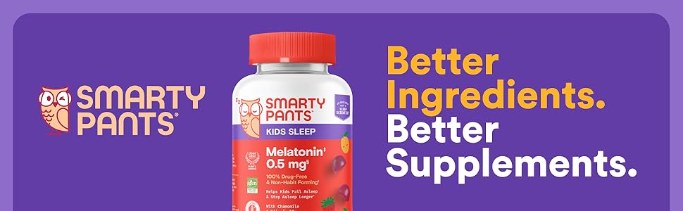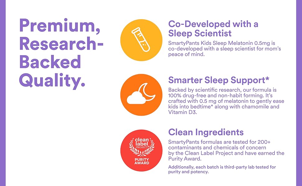 Co-developed with a sleep scientist, SmartyPants Kids Sleep Melatonin 0.5mg is expertly formulated with the lowest effective amount of melatonin, 0.5mg per 1 gummy serving, to help kids fall asleep and stay asleep longer.* Backed by scientific research, our formula is 100% drug-free and non-habit forming. It's crafted with low-dose Melatonin to gently ease kids into bedtime along with Chamomile and Vitamin D3.* SmartyPants Kids Sleep Melatonin 0.5mg may be taken as needed for sleep support* and can be paired with other SmartyPants formulas, such as our kids multivitamins. What's included in our formulas is just as important as what's not: all SmartyPants formulas are Certified Gluten-Free and Certified Free From™ the 9 Major US Allergens (milk, eggs, shellfish, soy, peanuts, wheat, fish, tree nuts, and sesame). Additionally, our products have no synthetic colors or artificial sweeteners. SmartyPants Kids Sleep supplements are certified clean, having earned the Clean Label Project® Purity Award. SmartyPants formulas are third-party lab tested and IGEN™ Non-GMO Tested, so, you can be sure you're giving your family high-quality supplements you can trust. *These statements have not been evaluated by the Food and Drug Administration. This product is not intended to diagnose, treat, cure, or prevent any disease.
