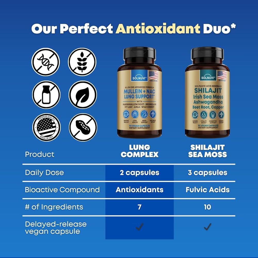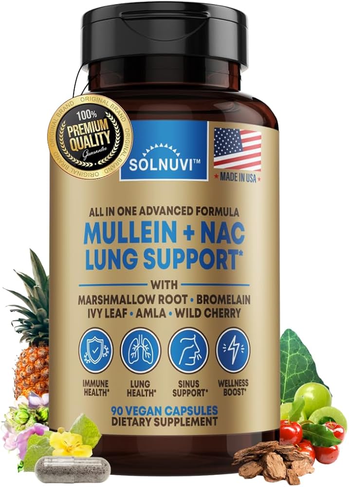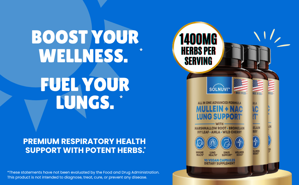 ABOUT OUR LUNG SUPPLEMENT: Solnuvi provides an all in one holistic supplement with lots of potent herbs in each serving, consisting of Mullein Leaf Extract, NAC or N-Acetyl Cysteine, Marshmallow Root, Wild Cherry Bark, Ivy Leaf with 10% Hederacoside C, Amla Fruit Powder, and Bromelain enzymes. These 7 ingredients are combined to create a potent synergy wellness boosting formula, and can also support one's daily antioxidant intake, bronchial health, respiratory clarity, and mucilaginous comfort.*