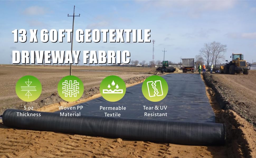 HEAVY DUTY & LONG LASTING - The 5oz thick woven PP construction resists tearing, punctures, and UV degradation. Built to withstand heavy vehicle traffic, construction equipment, and harsh weather conditions year after year. Suitable for both residential driveways and commercial construction projects.