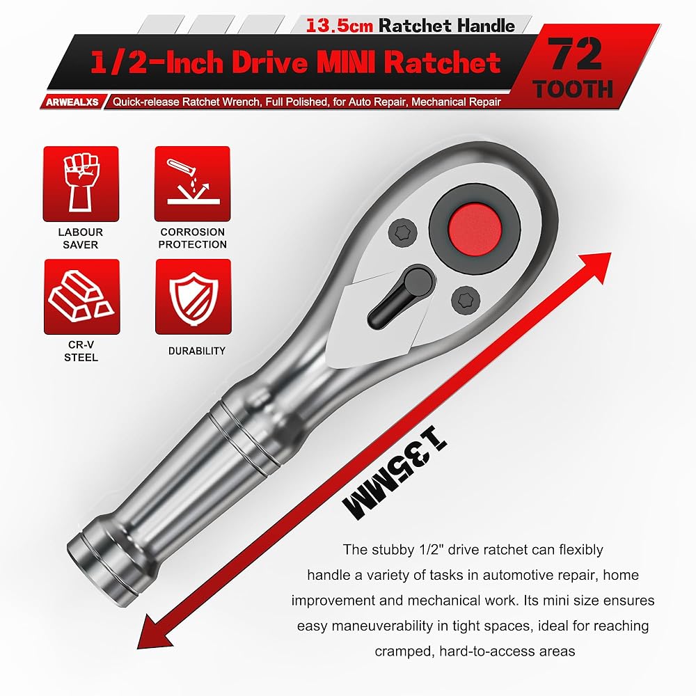 The reversible stubby ratchet can quickly adjust the positive and negative direction of the ratchet wrench, tighten or loosen the bolt efficiently and allows for easy change of direction in the middle of project without removing the socket from the fastener