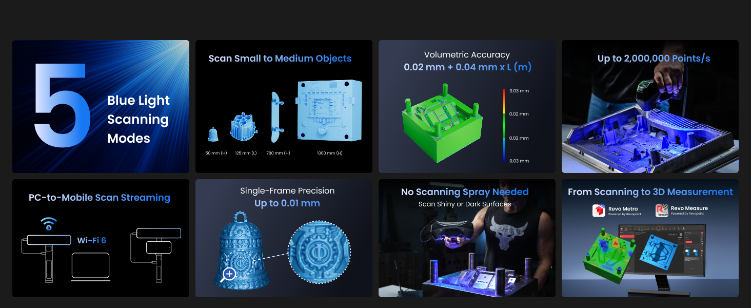 Fast Scans, No Scanning Spray Needed: Capture shiny and dark surfaces with ease, no scanning spray needed in any laser mode. Achieve high-efficiency results with scanning speeds of up to 2,000,000 points per second.