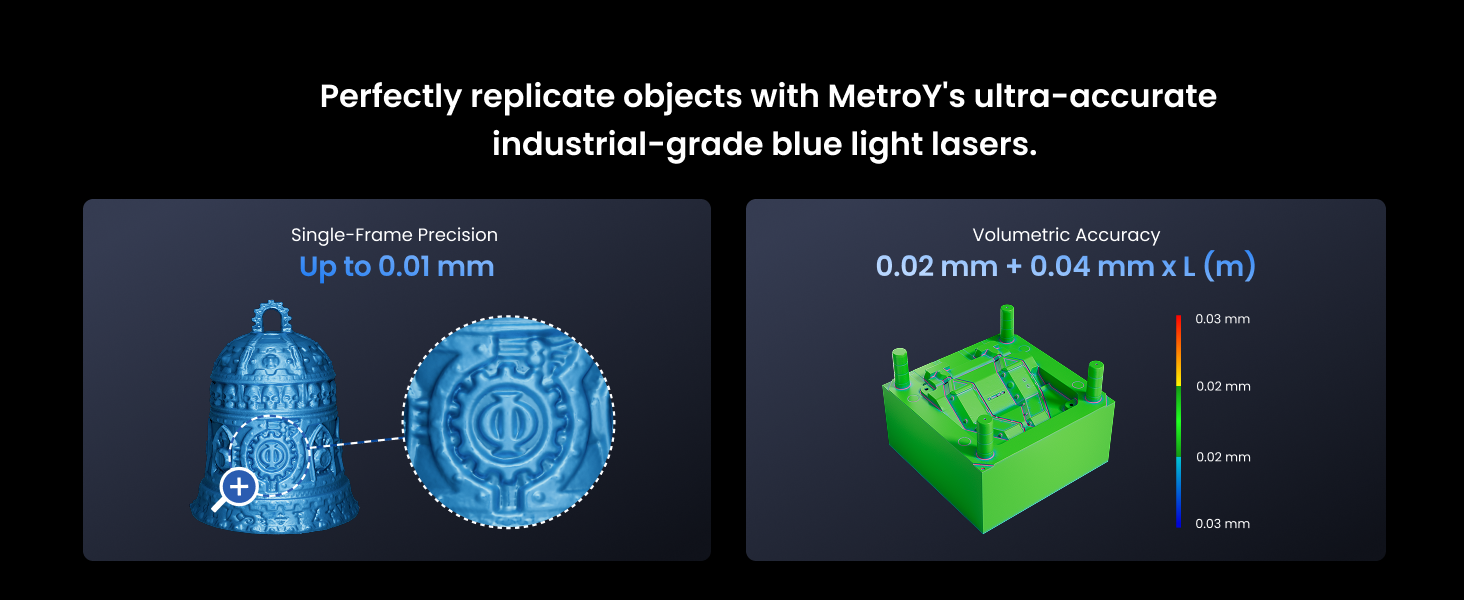Industrial-Grade Accuracy: Capture every detail flawlessly with MetroY's advanced blue lasers, offering precision of up to 0.01 mm, accuracy of up to 0.02 mm, and volumetric accuracy of up to 0.02 mm + 0.04 mm x L(m). It ensures accurate, reliable results for reverse engineering, metrology, and 3D printing.