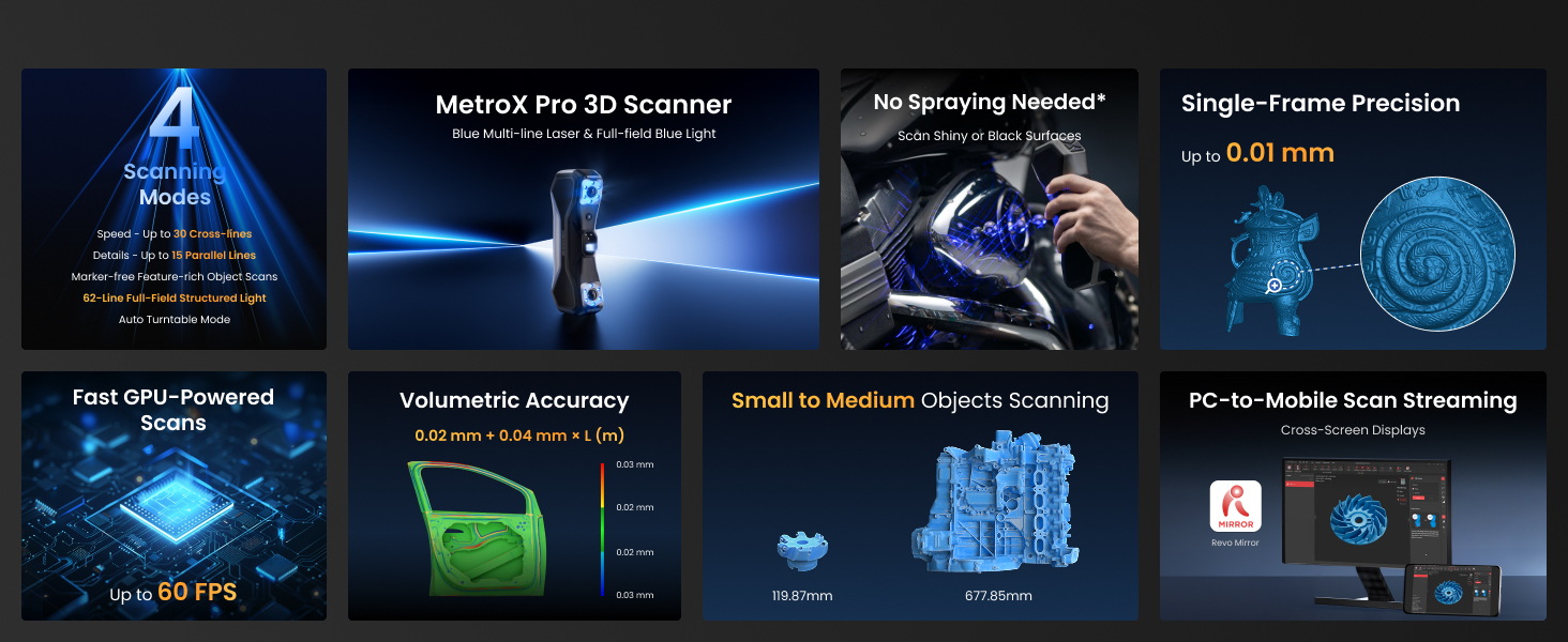 Four Scanning Modes: 30 Cross-line Lasers: Efficiently capture flat, shiny, or dark surfaces. 15 Parallel Lines: Capture fine features, edges, and corners. 62-line Full-field Blue Structured Light: Perform marker-free scans of feature-rich objects at up to 7 million points/second. Auto Turntable: One-click automated scans.