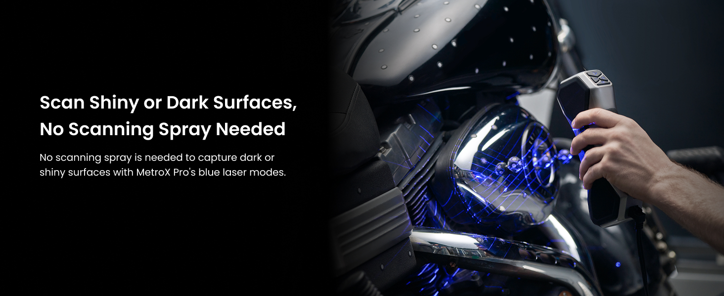 Effortlessly Scan Shiny or Dark Surfaces: No scanning spray is needed when using MetroX Pro's cross-line or parallel line modes to scan shiny or dark surfaces at up to 2,000,000 points per second.