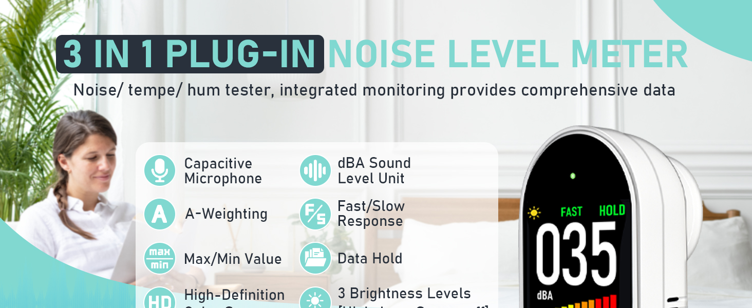 【Plug-in Design】Upgraded lsenlty plug-in noise detector overcomes the problems of battery aging and short battery life of traditional decibel meters. It is compatible with all standard US 110V to 220V AC power outlets in communities, homes, libraries, classrooms, and other places.