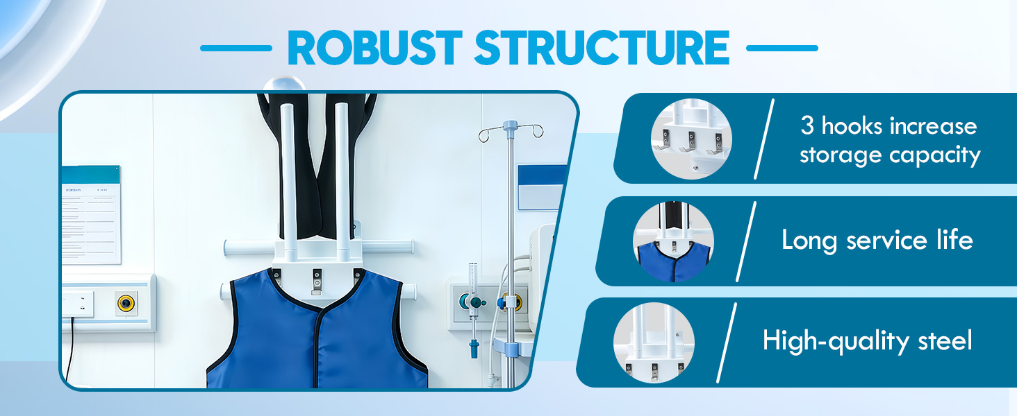 Apron hanger ensure lead aprons are properly hung over the shoulders, preventing folds or wrinkles, thus protecting the lead lining and outer fabric from damage and effectively extending the lifespan of your valuable protective gear