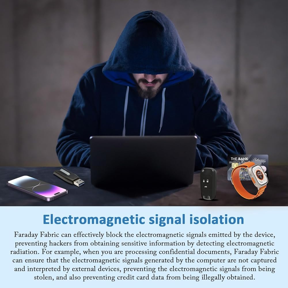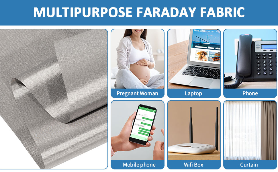 Product List : The kit includes 43" x 43"+ 79"L Faraday conductive tape, The fabric can be easily cut, sewn, or taped to surfaces for creating DIY faraday cages or RF shielding enclosures, The fabric comes with Faraday Fabric Tape, which can be used to tape together layers of Faraday Fabric ,To achieve complete signal shielding.