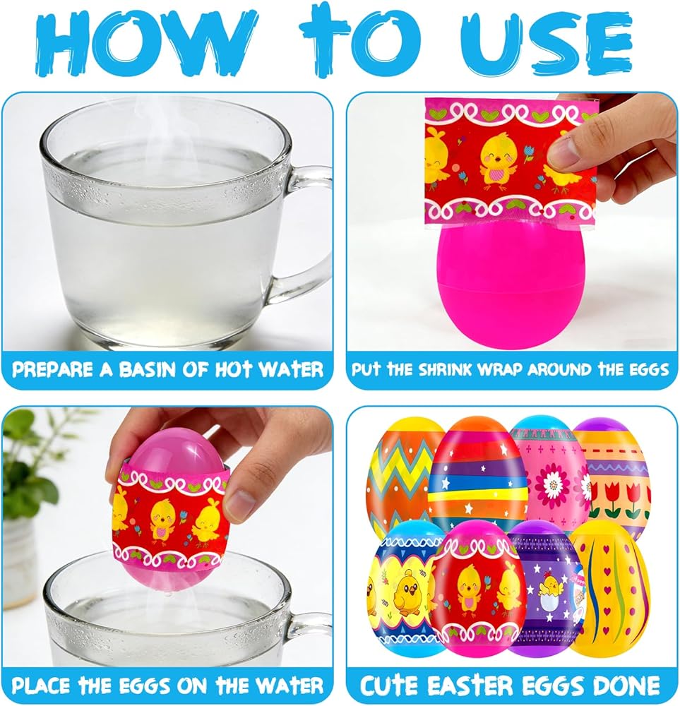 8 Vibrant Easter Designs and 50-Pack Value: Unleash a burst of Easter cheer with 50 heat shrink wraps in 8 adorable patterns! Just like the colorful chicks, bunnies, and florals shown in your pictures, these sleeves instantly transform plain eggs into festive masterpieces. Perfect for decorating a whole basketful of eggs for hunts, parties, or joyful home decor.