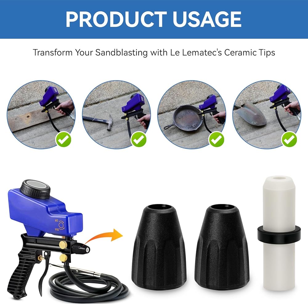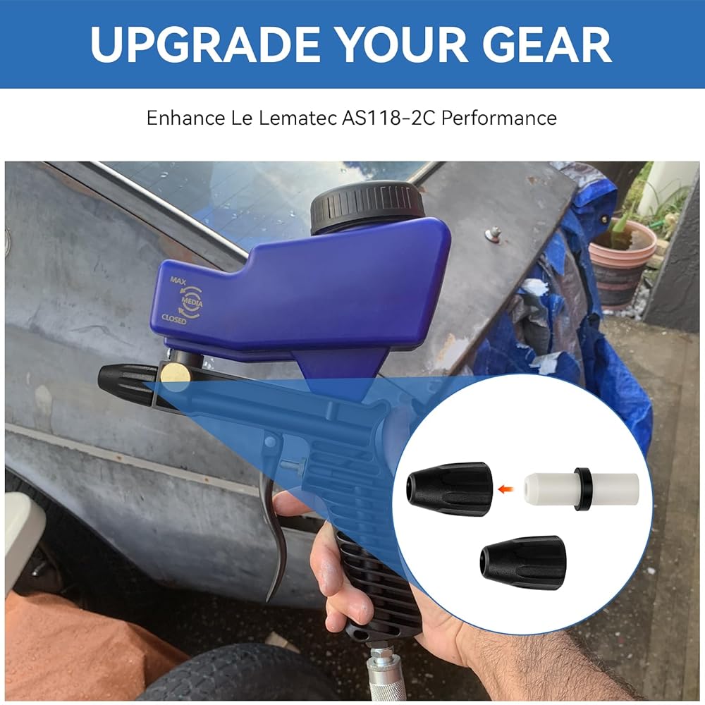 This sandblaster gun nozzle kit includes a premium ceramic tip and two heavy-duty black covers, designed specifically for the AS118 sandblaster gun. Whether you're working with walnut shells or 80-grit sand, this professional-grade kit delivers exceptional performance and durability