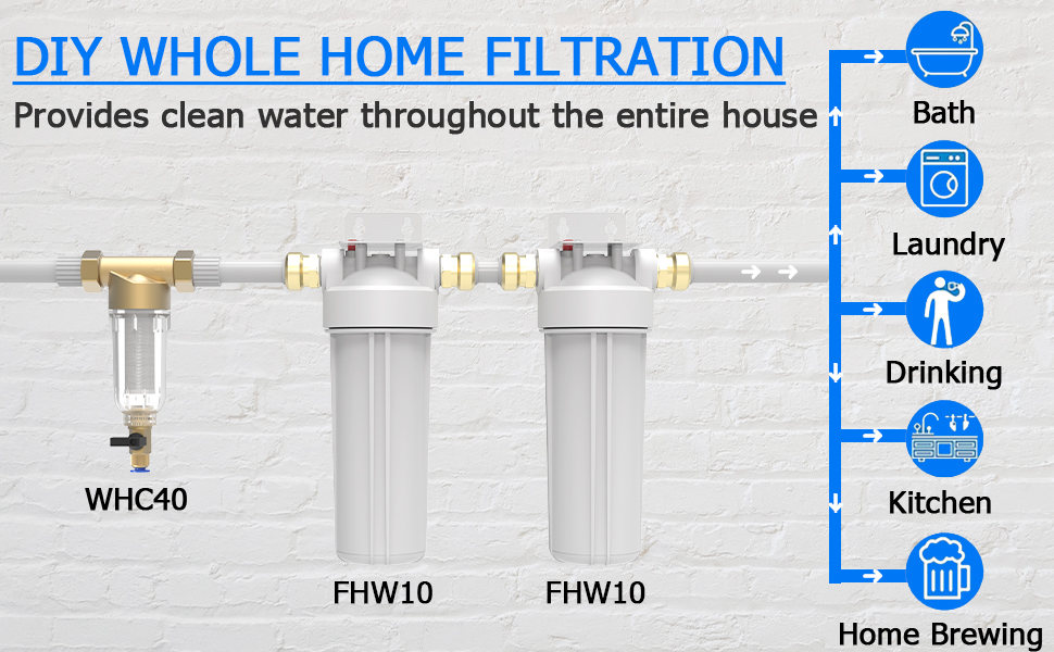 Superior Sealing: The MewMore FHW10 whole house water filter housing Fit for 10"x2.5" Sediment etc Water Filters with Pressure relief button, 3/4 inch inlet, thread port and Double O-ring, making sure no water leaks after long-term use. Note: Avoid excessive use of Teflon tape during installation.